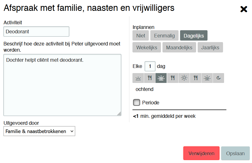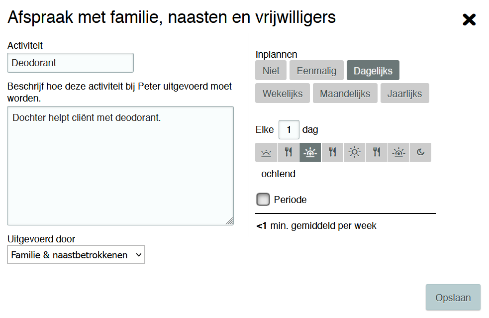 Het is belangrijk dat het bestaande sociale netwerk van de cliënt zoveel mogelijk behouden wordt. Bespreek met de cliënt en diens vertegenwoordiger welke activiteiten familie, naastbetrokkenen of vrijwilligers op zich nemen. De activiteiten die worden uitgevoerd door familie en/of naastbetrokkenen en/of vrijwilligers wordt niet opgeteld bij de tijd van het zorgzwaartepakket.LET OP! De gebruiker dient eerst een gesprek te starten door op de knop 'Bewerken' te klikken in de tegel 'Afspraken'.