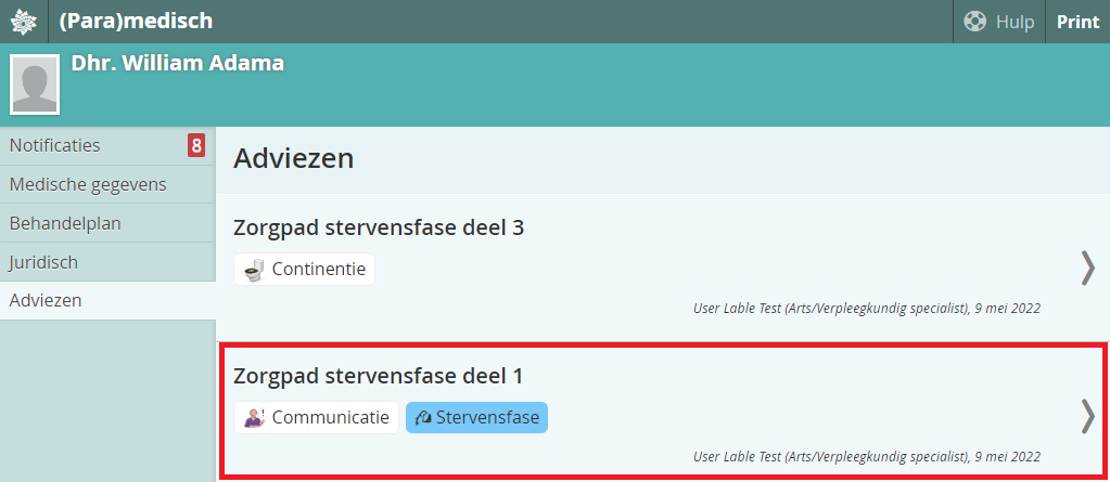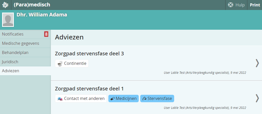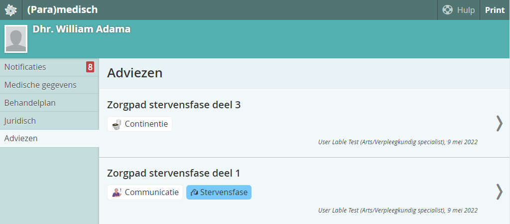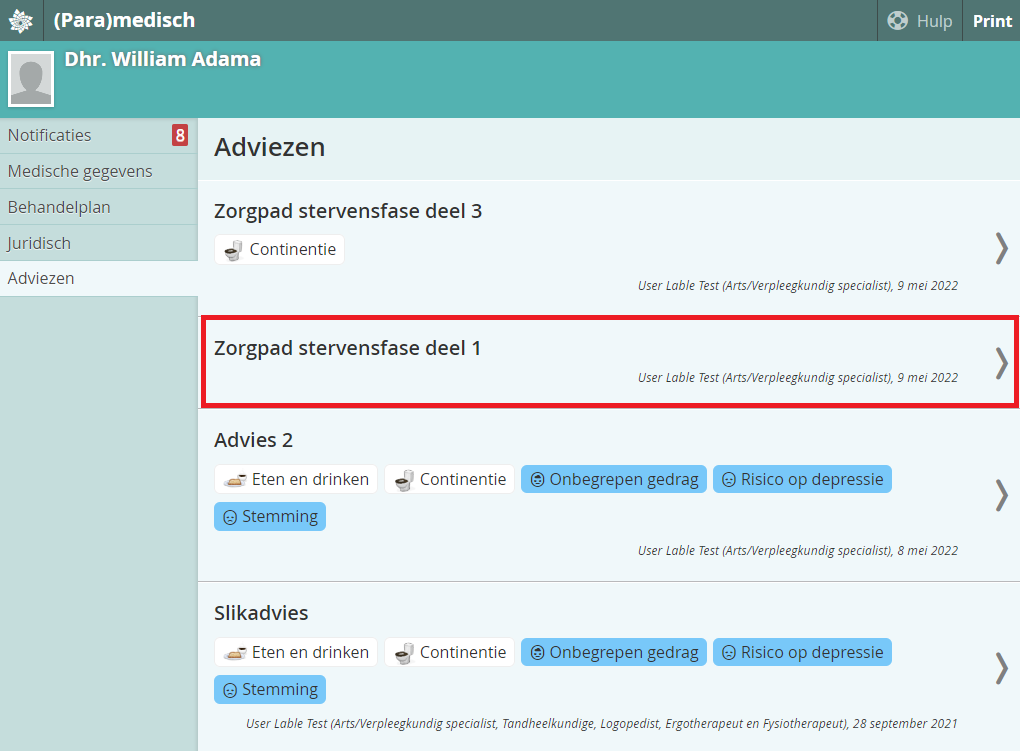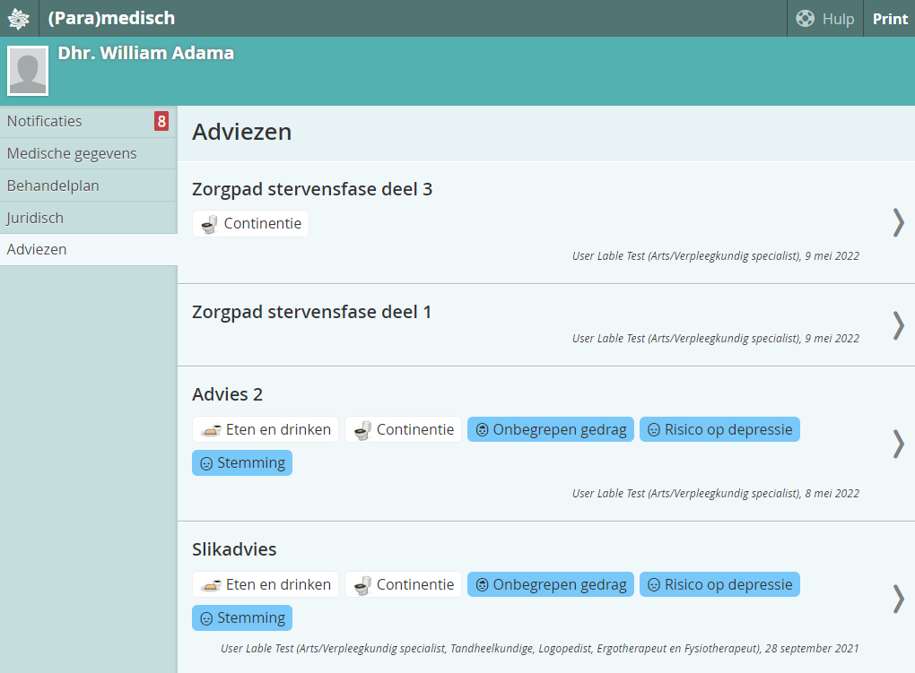 De adviezen vanuit Ysis worden nu getoond in Lable Care. Zodra er een nieuw advies of een wijziging op een advies binnenkomt in Lable Care wordt er op de 'Tijdlijn' een bericht getoond. Het nieuwe advies (of de wijziging) is vervolgens te zien onder het menu 'Adviezen' van de tegel '(Para)Medisch'. Het advies kan vervolgens gekoppeld worden aan één of meerdere basis- en/of zorgbehoeftes. Nadat het advies is gekoppeld wordt de knop 'Adviezen' getoond bij de betreffende basis- en/of zorgbehoefte.