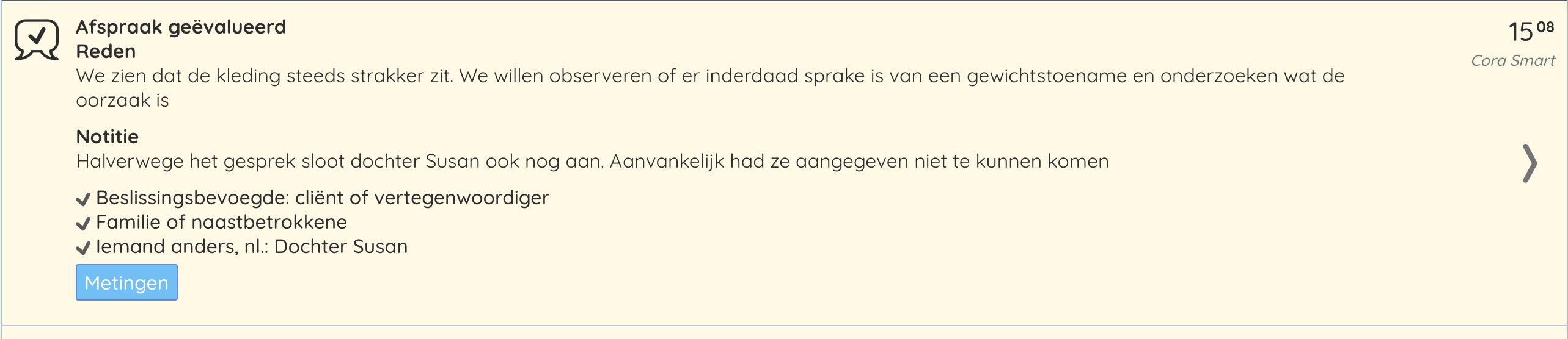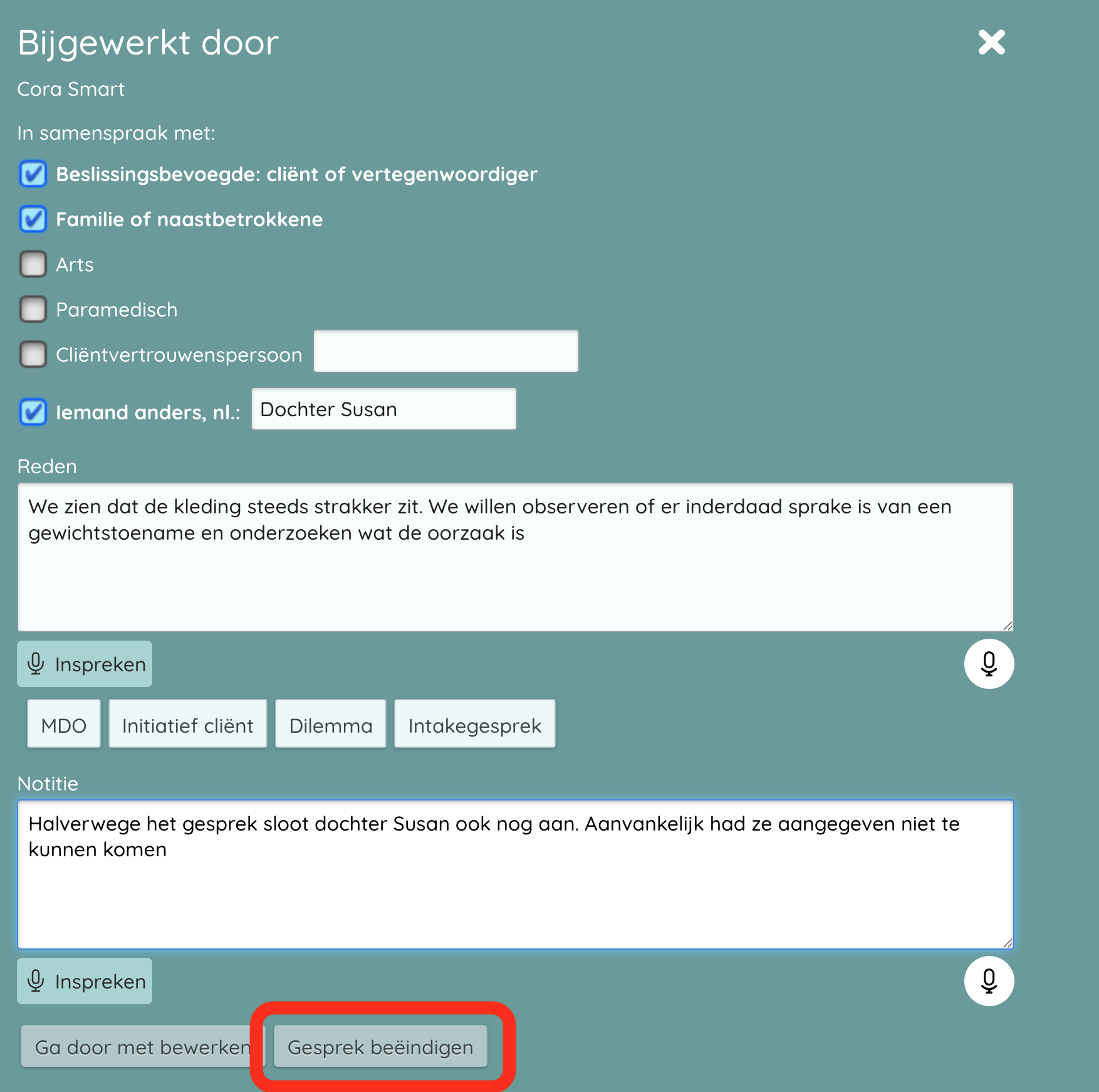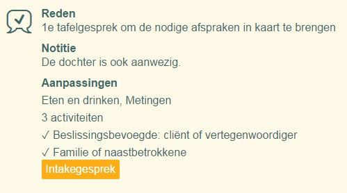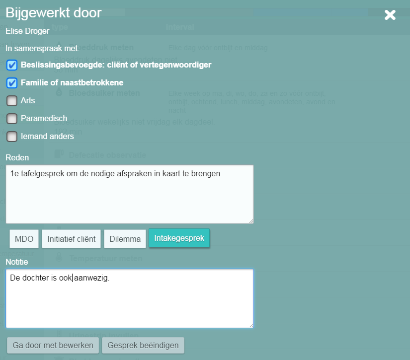 - Controleer de gegevens omtrent de aanwezigen bij het gesprek, de reden van het gesprek en eventuele aanvullende notities bij de aanpassing.