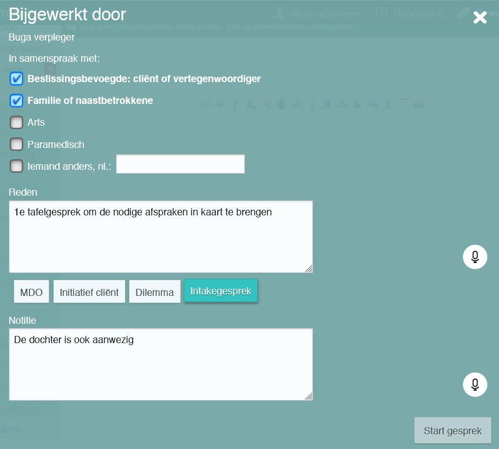- Selecteer wie deelneemt aan het gesprek en wat de reden van het gesprek of de wijziging is (je kunt deze gegevens bij het afsluiten van het gesprek nog bijwerken of aanvullen).