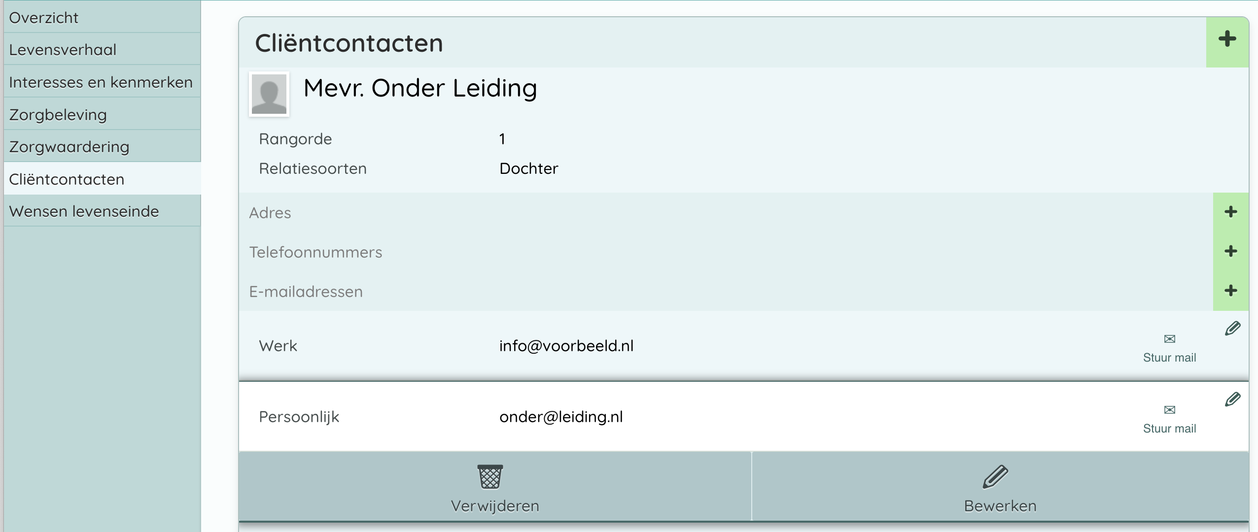 LET OP! We adviseren om de functionaliteit voor het toevoegen en wijzigen alleen te activeren als er geen koppeling met een basisadministratie is voor het vullen van cliëntcontacten. Zie voor meer informatie Cliëntcontacten.