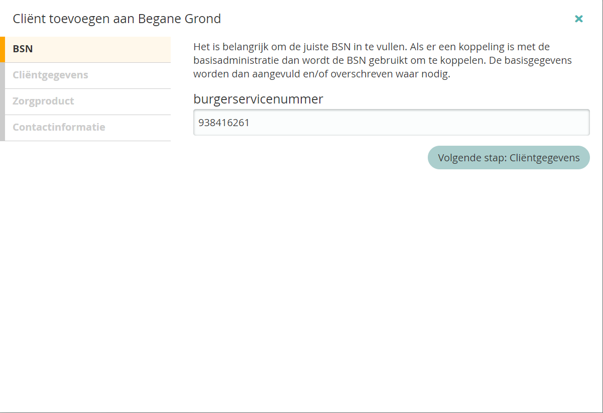 - Voer het burgerservicenummer (BSN) van de cliënt in. Bevat het BSN maar 8 cijfers dan wordt er automatisch een voorloopnul voor gezet. Na invoer van een correct BSN wordt de knop 'Volgende stap: Cliëntgegevens' actief.