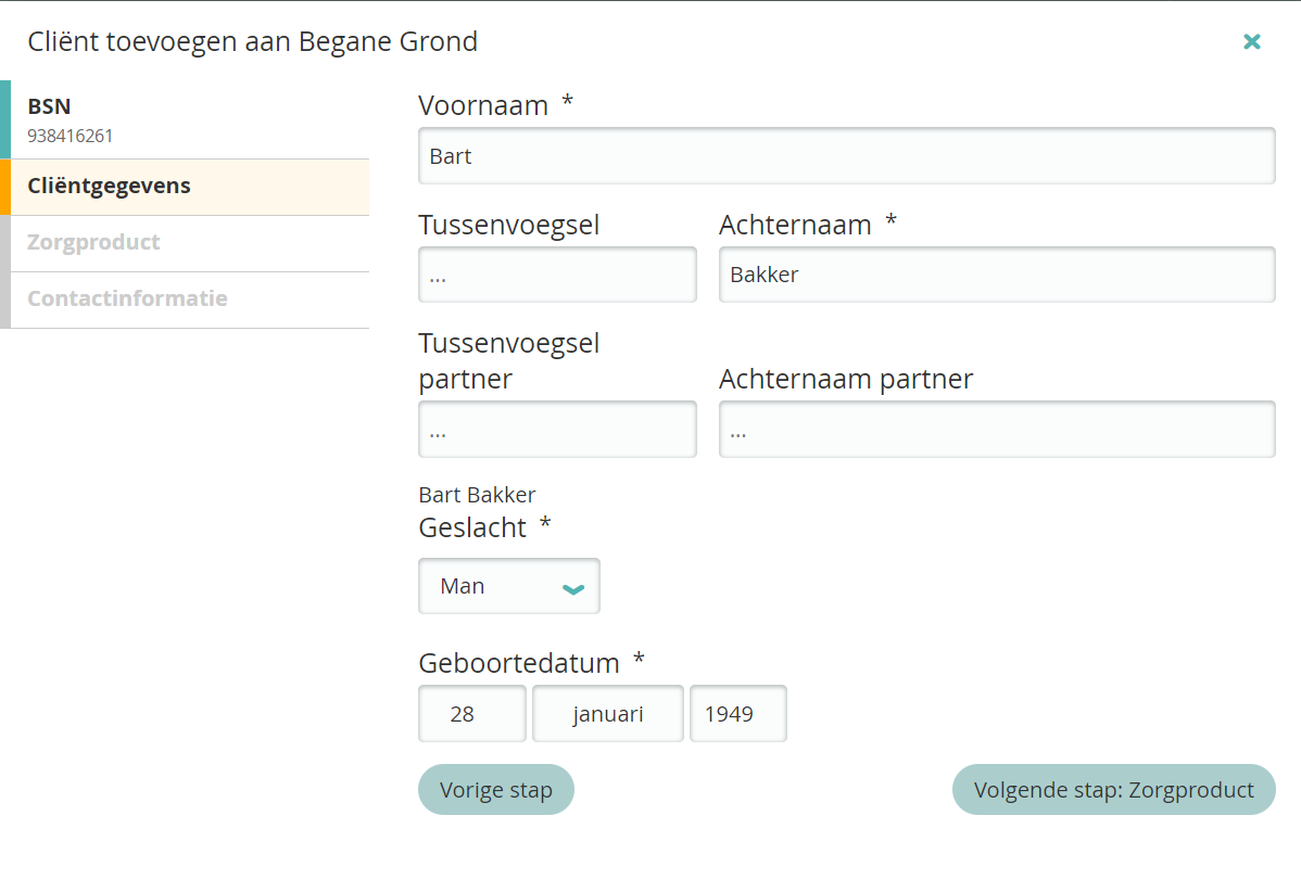 - Vul overige cliëntgegevens die bekend zijn in zoals de geboortedatum, het geslacht en de volledige naam.