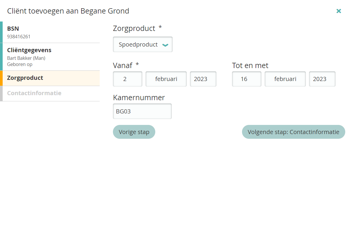 - Klik op 'Volgende stap: Zorgproduct' om door te gaan.