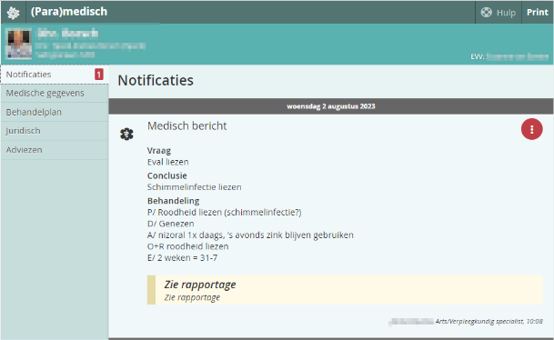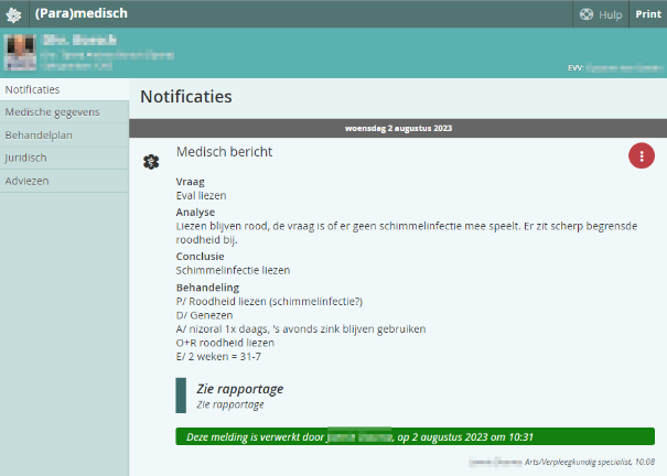 Je ziet nu dat het cijfertje aan de linkerkant verdwenen is en de gele arcering verdwenen is. In de groene balk zie je wie de notificatie verwerkt heeft.