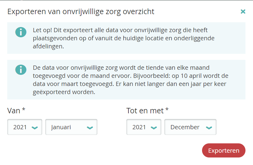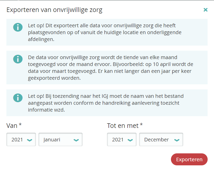- Alle registraties van onvrijwillige zorg worden in een .xml bestand geëxporteerd.