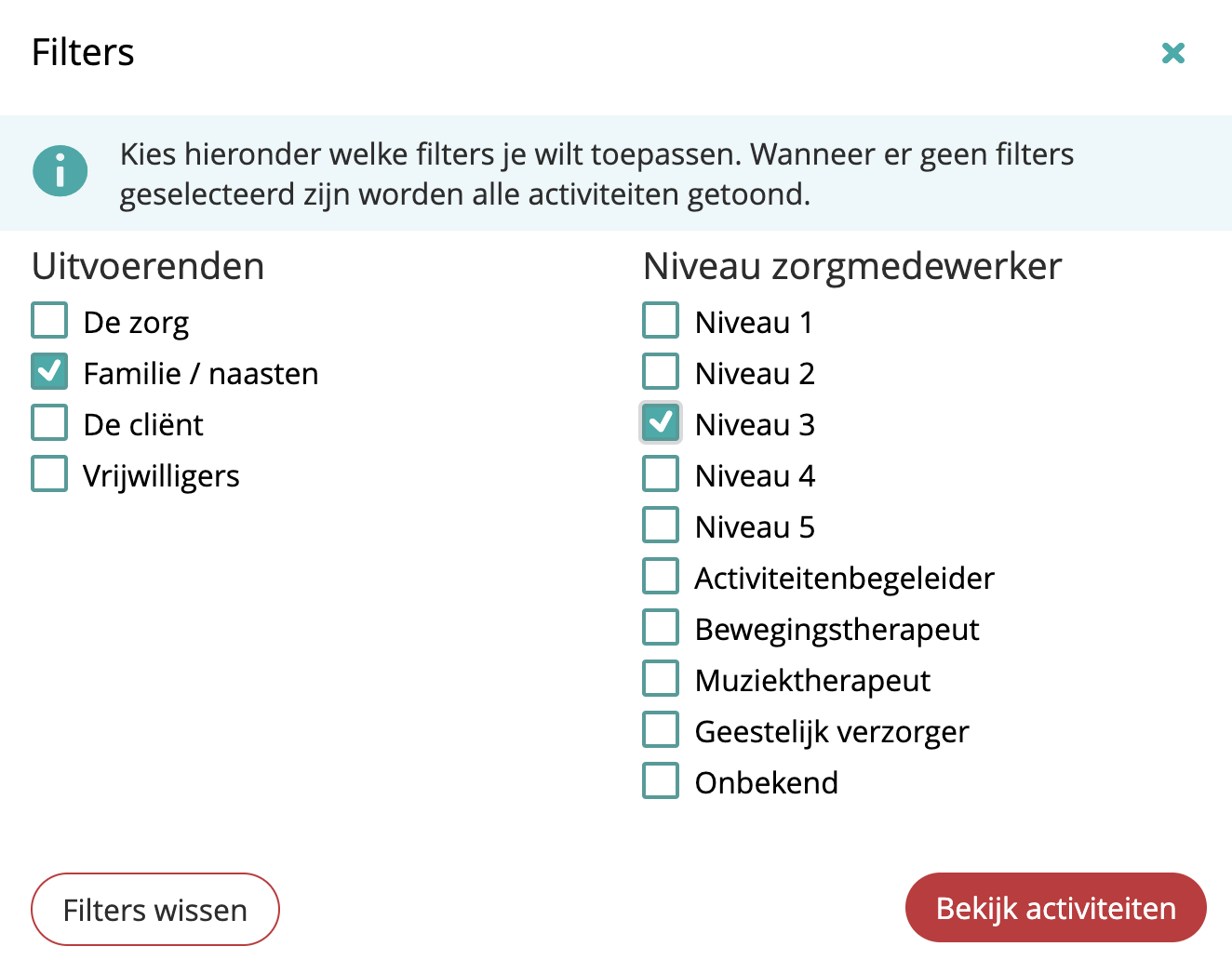 - Daarnaast kan je aan de rechterkant van het scherm ook nog aangeven van welke zorgmedewerker(s) je de activiteiten wilt zien in het onderdeel 'Niveau zorgmedewerker'.