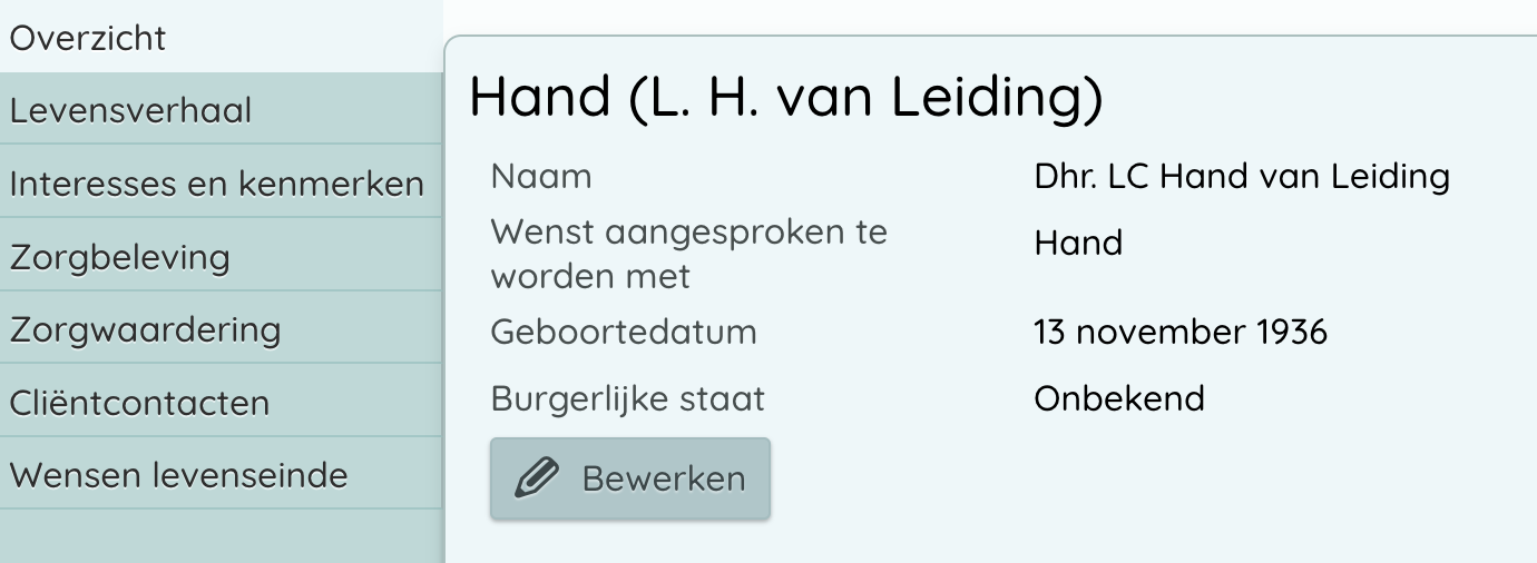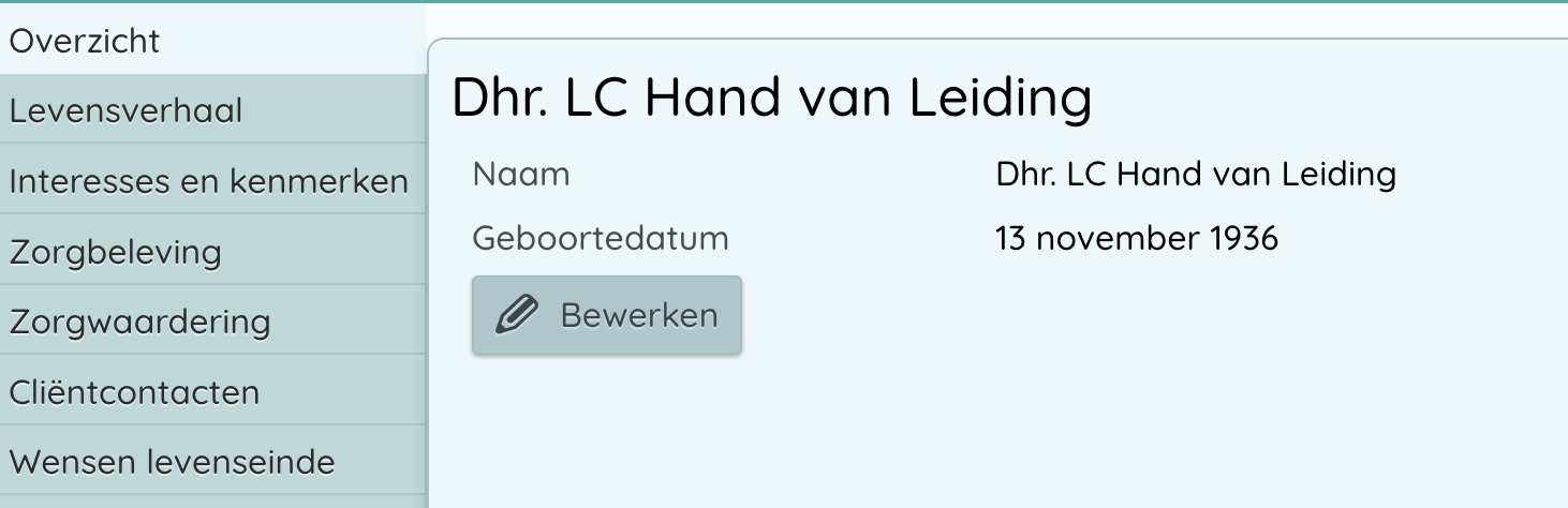 Het is prettig om de cliënt aan te kunnen spreken op de manier zoals diegene dat wenst. Daarom is er de optie om de 'Gewenste aanspreekvorm' in te stellen bij een cliënt. De ingevulde tekst wordt vervolgens getoond in de cliëntenbalk en op het tegelscherm. En bij het toevoegen of bewerken van een 'Rapportage', 'Meting', 'Incident' of 'Observatie' op de 'Tijdlijn'.