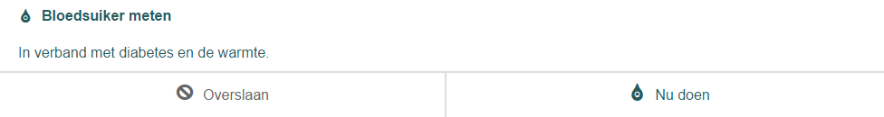 Voorbeeld: Als de Bloedsuiker meting iedere 1e maandag van de maand tijdens de lunch gedaan moet worden en de keuze 'Overslaan' gebruikt wordt, komt de herinnering pas de volgende maand weer terug. (En dus niet het eerstkomende dagdeel of de volgende dag tijdens de lunch).