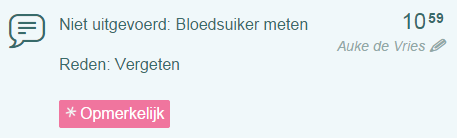 N.B. Zorgactiviteiten kunnen niet 'afgevinkt' of 'overgeslagen' worden, vergelijkbaar met metingen. Is de zorgactiviteit uitgevoerd, zorg er dan voor dat je dit communiceert met je collega's. Bijvoorbeeld door een rapportage te schrijven om te voorkomen dat iemand anders hetzelfde gaat doen.