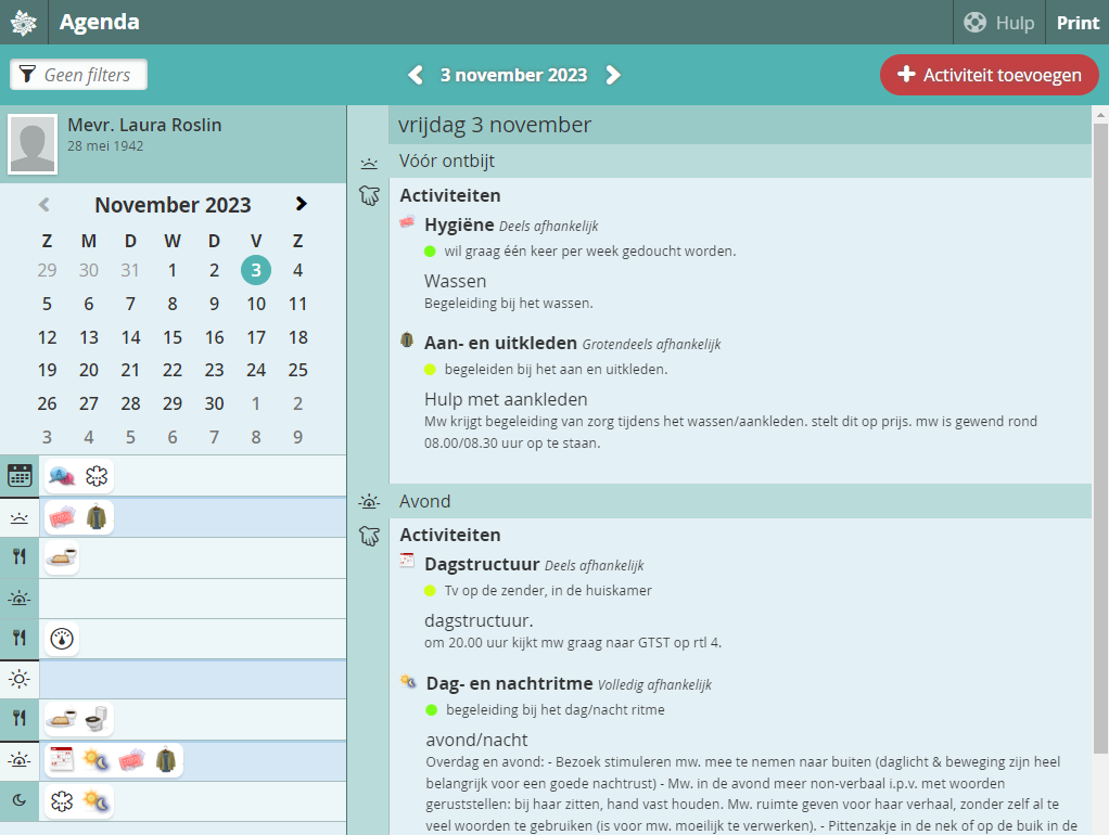 De pagina is te printen om een tijdelijke of nieuwe zorgmedewerker snel een overzicht te bieden. De weergave aan de rechterzijde wordt bepaald door de dagdelen die aan de linkerzijde aangeklikt zijn.
