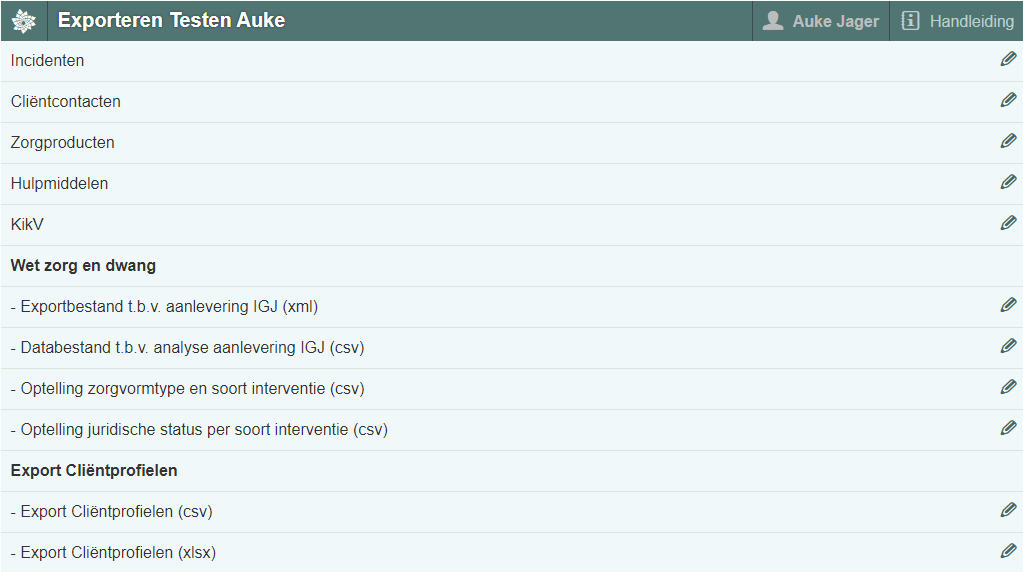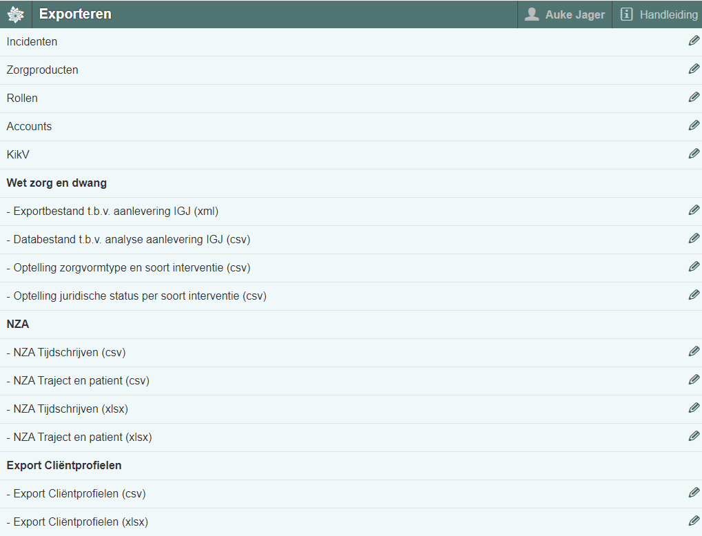 'Exporteren' biedt medewerkers met een bepaalde rol de mogelijkheid om gegevens te exporteren. Standaard worden gegevens in .csv-formaat geëxporteerd.Voor de aanlevering aan KikV is de data in .ttl-formaat (graaf). Voor de aanlevering aan de IGJ is de Wet Zorg en Dwang data in .xml-formaat.