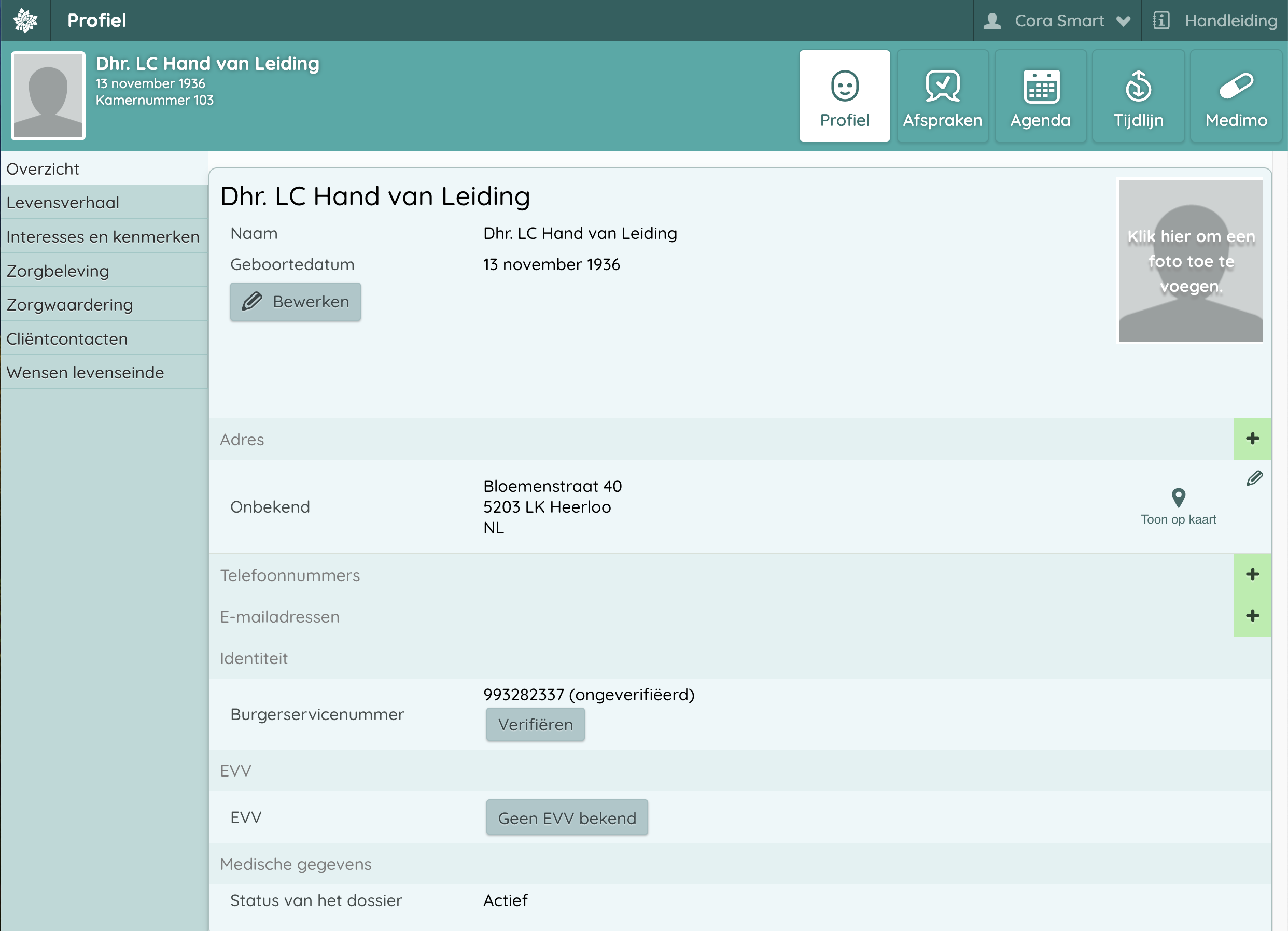 Profiel toont persoons- en contactinformatie. Een deel van deze informatie kan afkomstig zijn uit de basisadministratie en middels een koppeling ingelezen. Persoonlijke informatie zoals het levensverhaal geven achtergrond-informatie over de cliënt.
