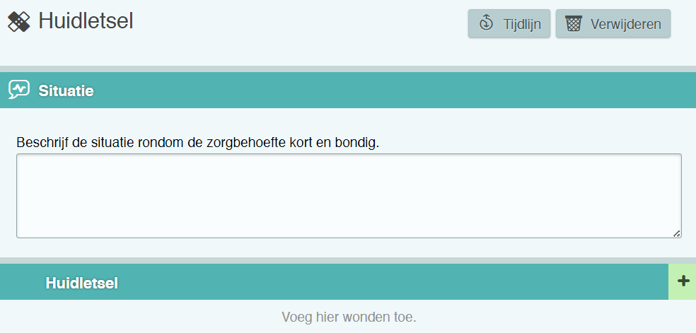 Bij o.a. smetten en eczeem kan de situatie beschreven worden in het vak 'situatie' en vervolgens kunnen de hulpmiddelen en activiteiten worden toegevoegd.