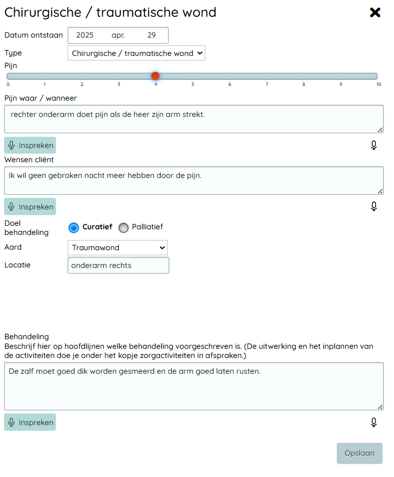 - Vul de overige gegevens in (Dit verschilt per wondtype).