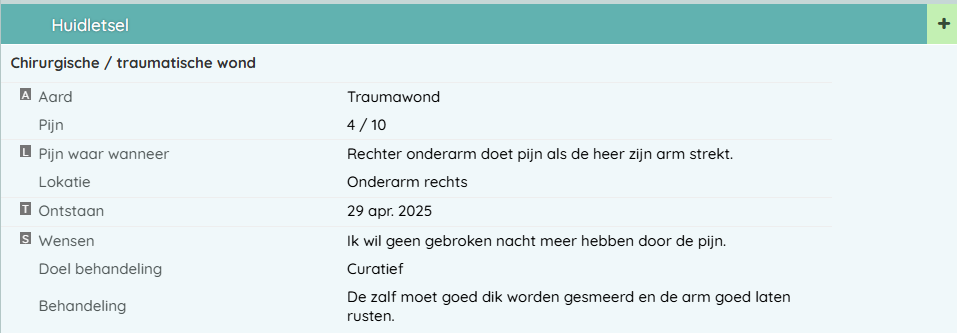 Alleen wanneer er sprake is van een wond, wordt het onderdeel 'huidletsel' gebruikt om de wond gestructureerd toe te voegen. Volg dan de stappen zoals hieronder beschreven.