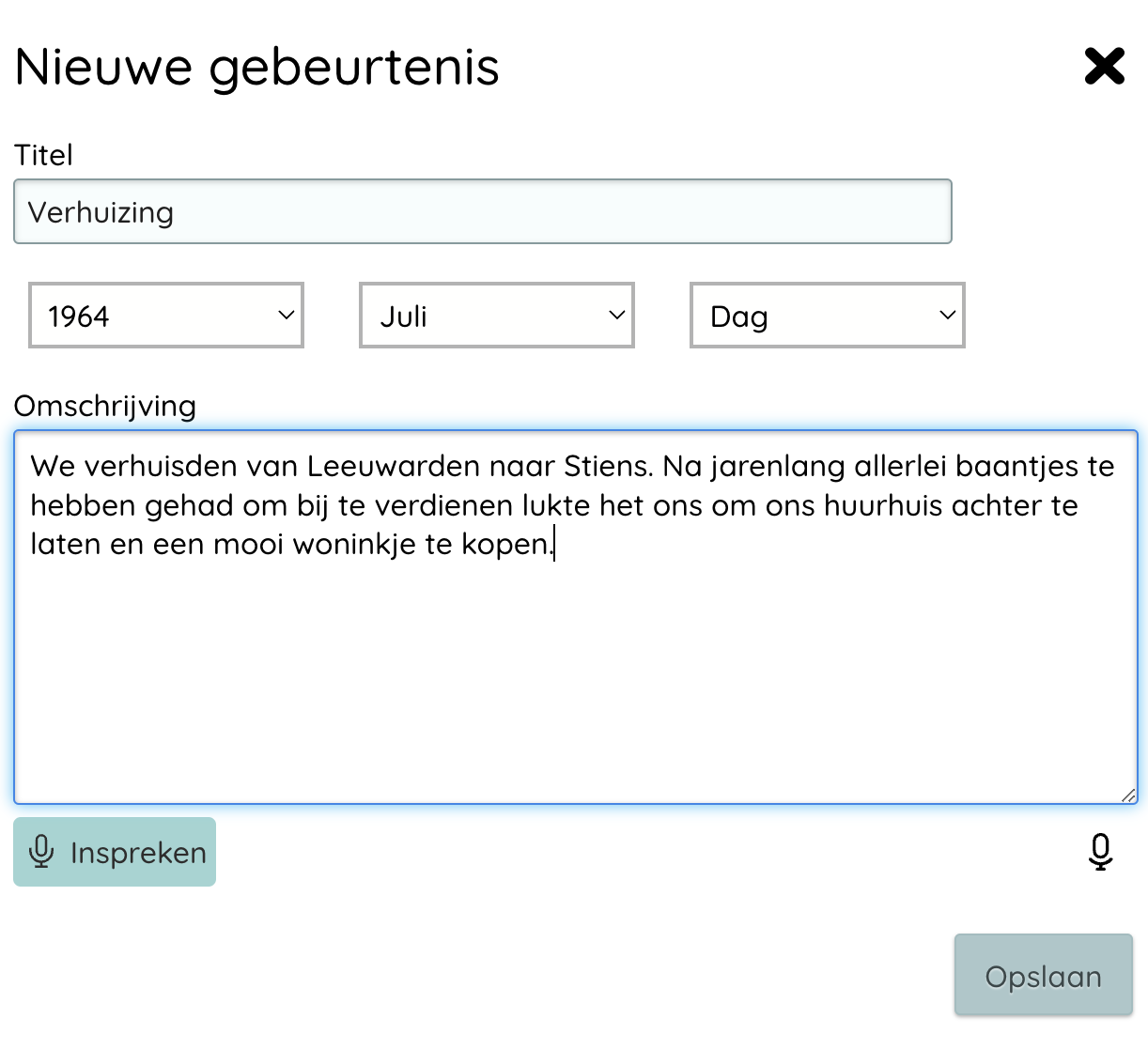 - Geef de gebeurtenis een titel, omschrijving en een jaartal (of datum). Bevestig met de knop 'Opslaan'.