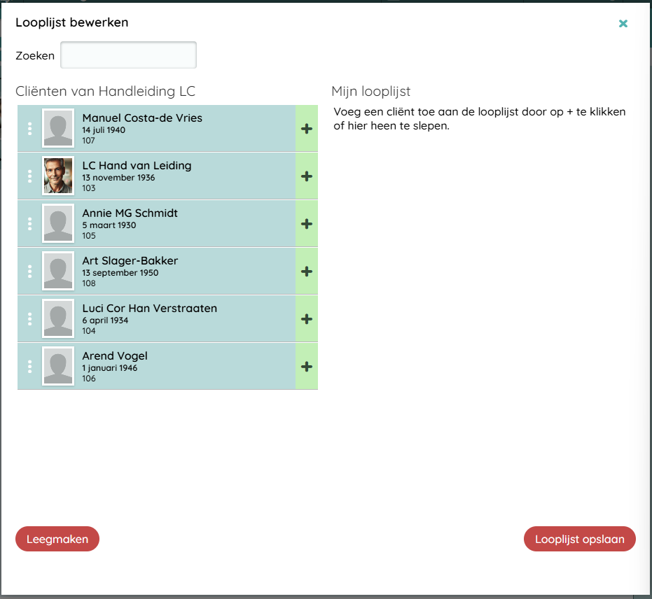 - Voeg een cliënt toe aan de looplijst door op de '+' knop te klikken of de cliënt naar rechts te slepen. De cliënt komt onder 'Mijn looplijst' te staan. Voeg de cliënten toe die je op je looplijst wilt hebben staan.