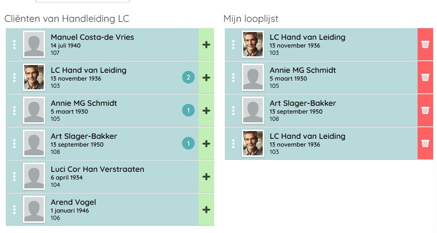 - Je kunt een cliënt ook meerdere keren toevoegen aan je looplijst. Aan de cijfertjes in de kolom links achter de cliëntnaam zie je hoe vaak die voorkomt in de looplijst.