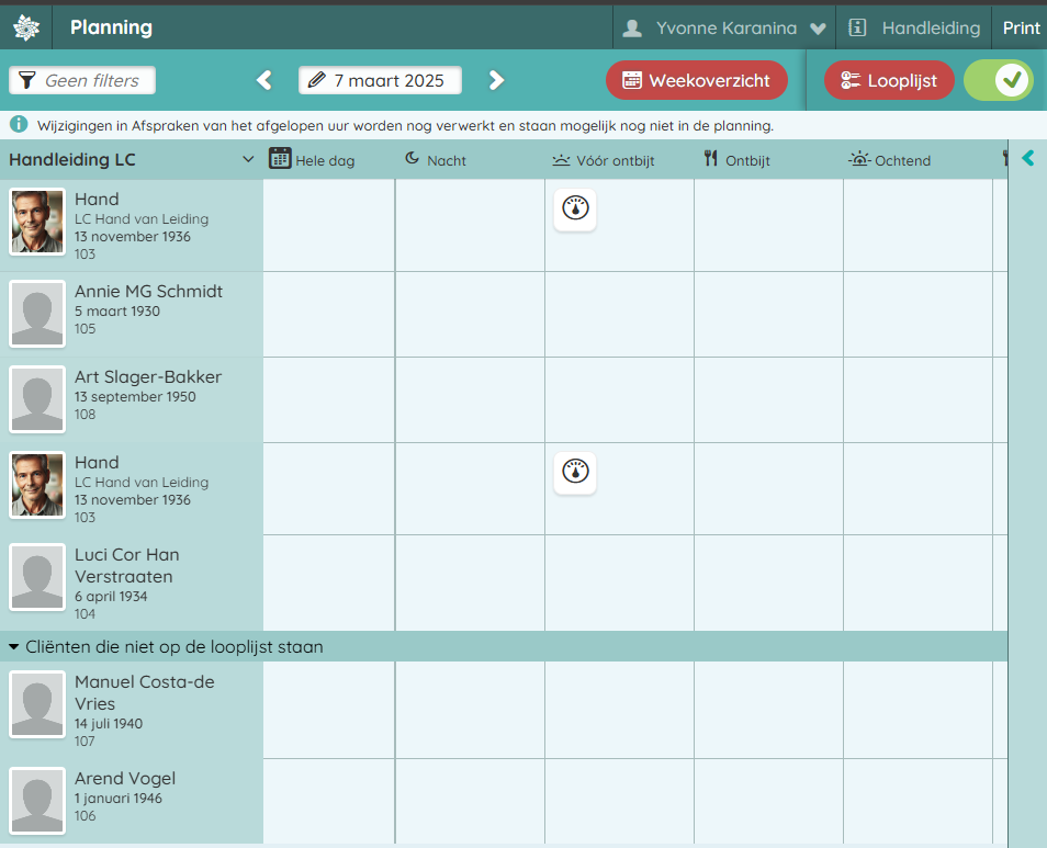- Je komt nu weer in het planningsscherm, waar bovenaan de cliënten staan van je looplijst. Door te klikken op het groene vinkje rechtsbovenin kun je aangeven of je de looplijst wilt zien of verbergen.