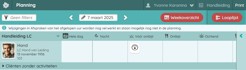 Het is mogelijk om in de tegel 'Planning' een looplijst aan te maken. Deze lijst bestaat uit (een deel van de) cliënten van de afdeling die op een gewenste volgorde worden gezet. Een cliënt kan ook vaker op de lijst voorkomen. Vervolgens wordt de planning ook in deze volgorde getoond. Wanneer een looplijst wordt geactiveerd, worden alle cliënten die niet op deze lijst staan, standaard verborgen, maar zijn onderaan wel weer zichtbaar te maken.Looplijst bewerken