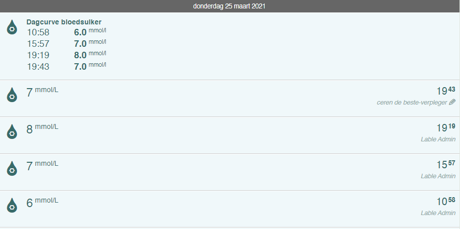 Als er op een dag meerdere bloedsuikermetingen gedaan zijn dan wordt de volgende dag automatisch een 'Bloedsuikercurve' gemaakt en geplaatst op de 'Tijdlijn'.