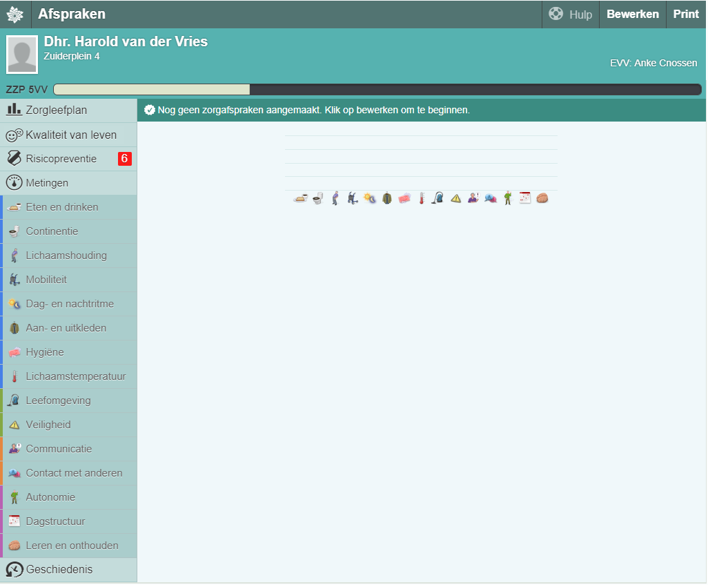 Voorheen moest van elke nieuwe cliënt de risico's geïnventariseerd worden. Daarom zie je een rood vlak met '6' bij het onderdeel 'Risicopreventie'. Dit is echter niet meer verplicht voor de zorg.