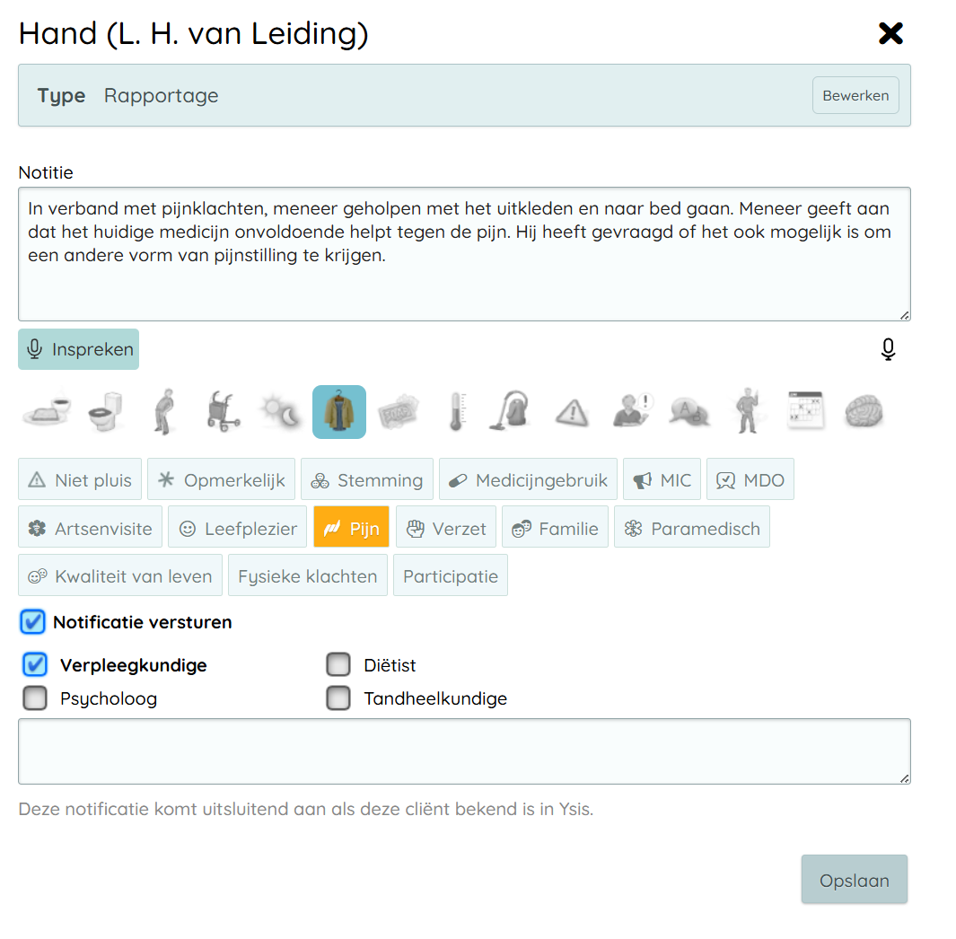 - In Ysis wordt de notificatie/het bericht los van de rapportage getoond. Een tekst als 'zie verslag' is verwarrend voor de behandelaren in Ysis. Wees daarom in de notificatie altijd volledig.
