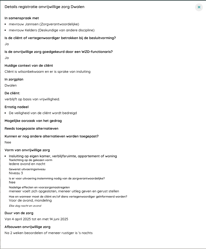 Hier worden de vormen van onvrijwillige zorg getoond die in het zorgplan zijn afgesproken. In uitzonderlijke gevallen kan het zich voordoen dat er onvrijwillige zorg moet worden toegepast, terwijl daar niets over is afgesproken in het zorgplan. Selecteer in dat geval 'Ongeplande onvrijwillige zorg in onvoorziene situaties'