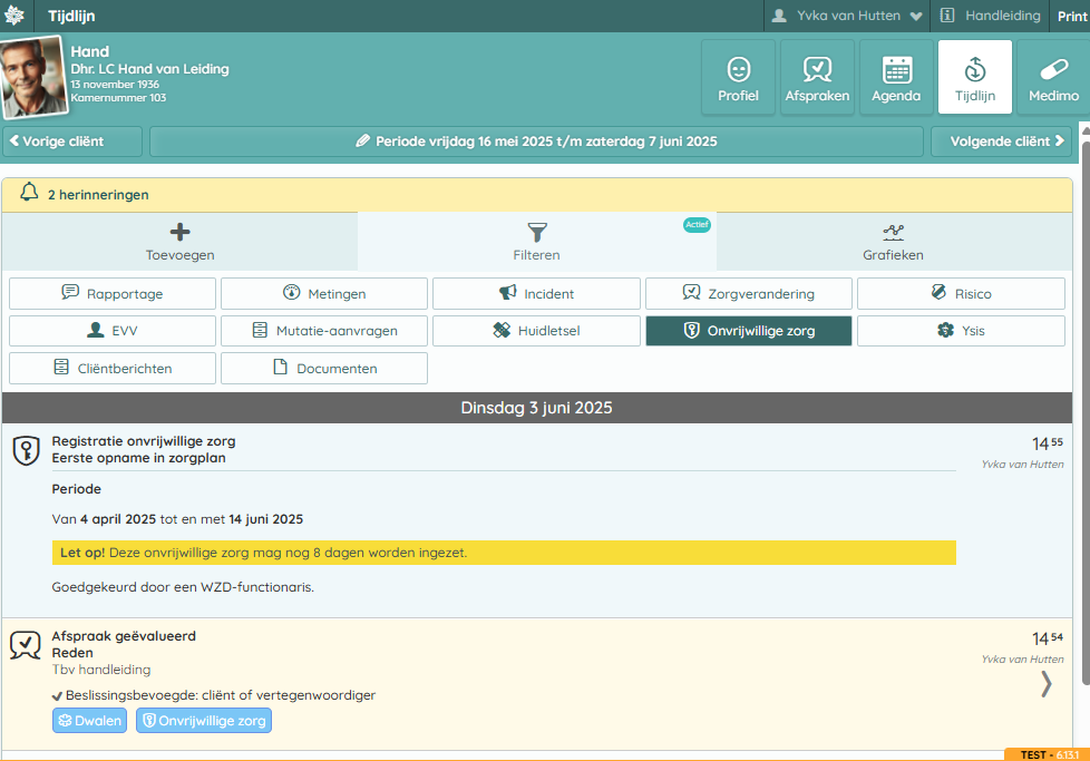 - Klik op het tijdlijnbericht waarin de uitvoering van onvrijwillige zorg is vastgelegd