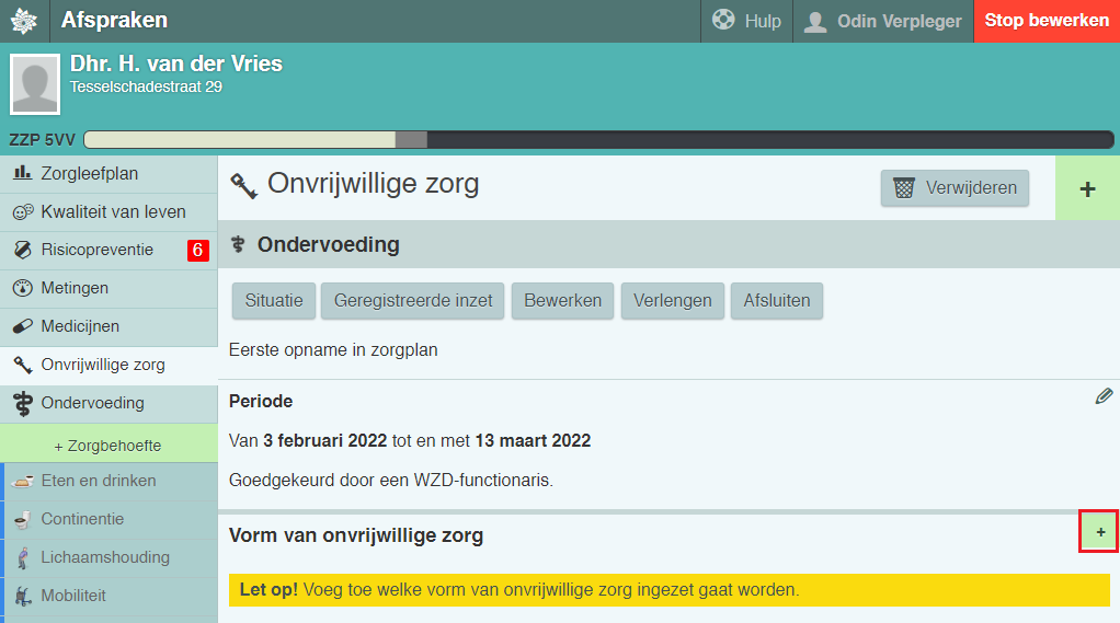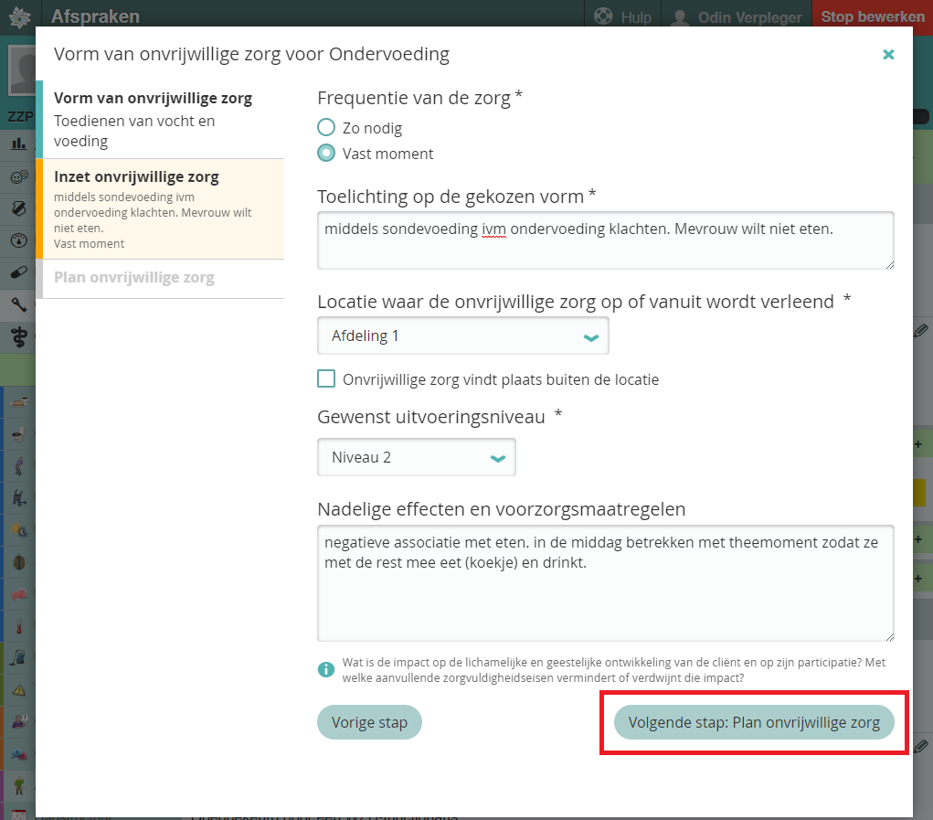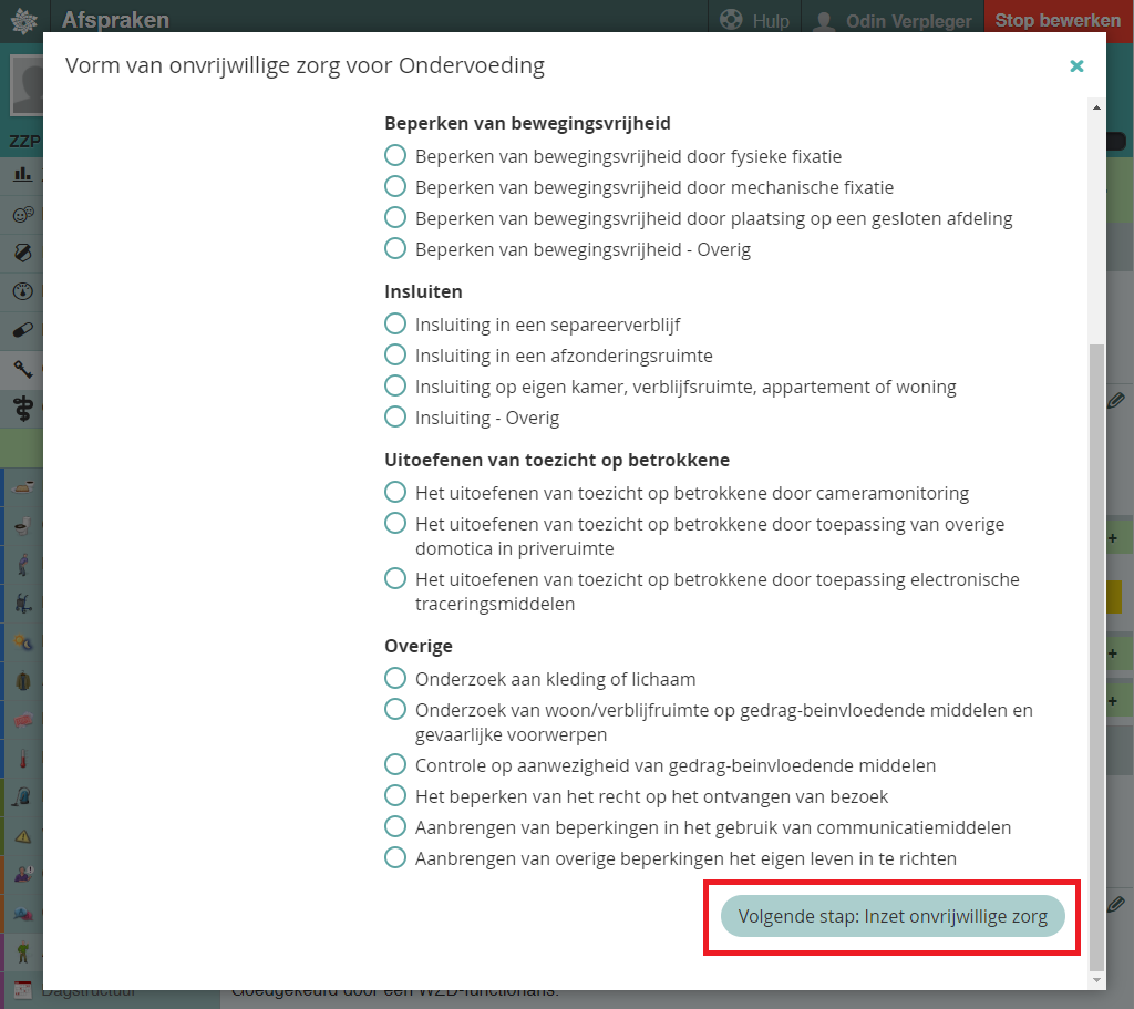 - Klik vervolgens op de knop ’Volgende stap: Inzet onvrijwillige zorg’.