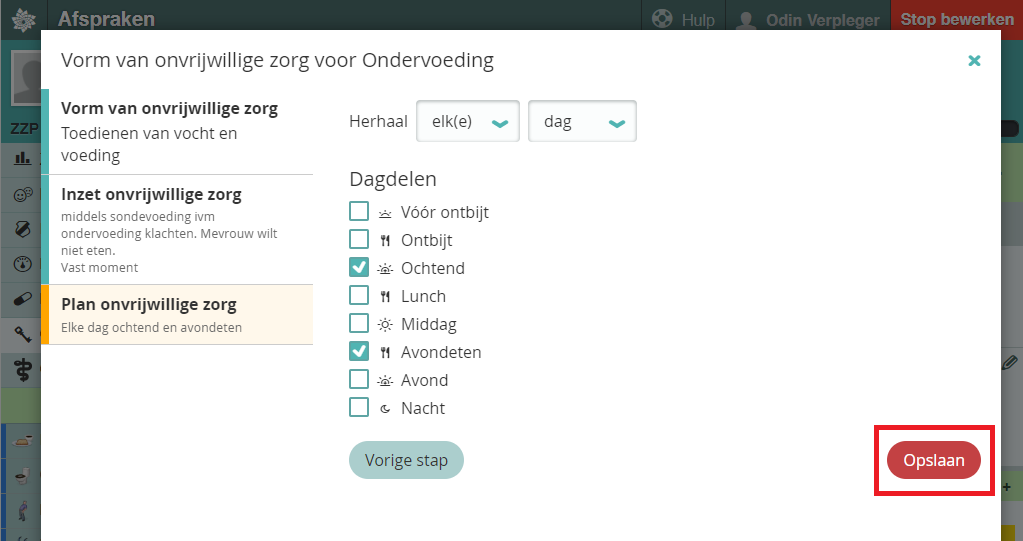 - Vul het formulier verder in. De vragen waar een ’*’ achter staat zijn verplicht te antwoorden. Wanneer de frequentie een ’Vast moment’ komt er een derde stap bij in het formulier, zoals in dit voorbeeld. Klik op ’Volgende stap: Plan onvrijwillige zorg’.