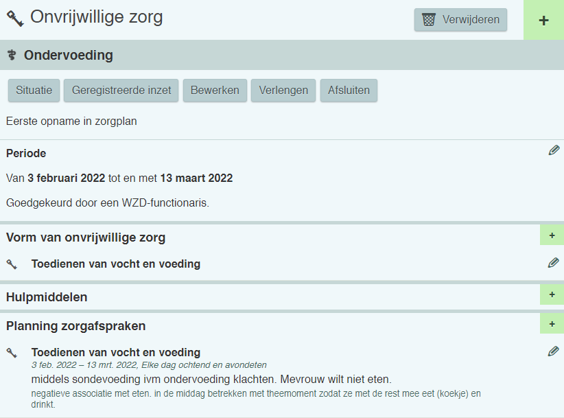 - De vorm van onvrijwillige is te vinden onder het kopje ’Vorm van onvrijwillige zorg’ en de afspraken die zijn gemaakt met betrekking tot de toepassing staat onder het kopje ’Planning zorgafspraken’.