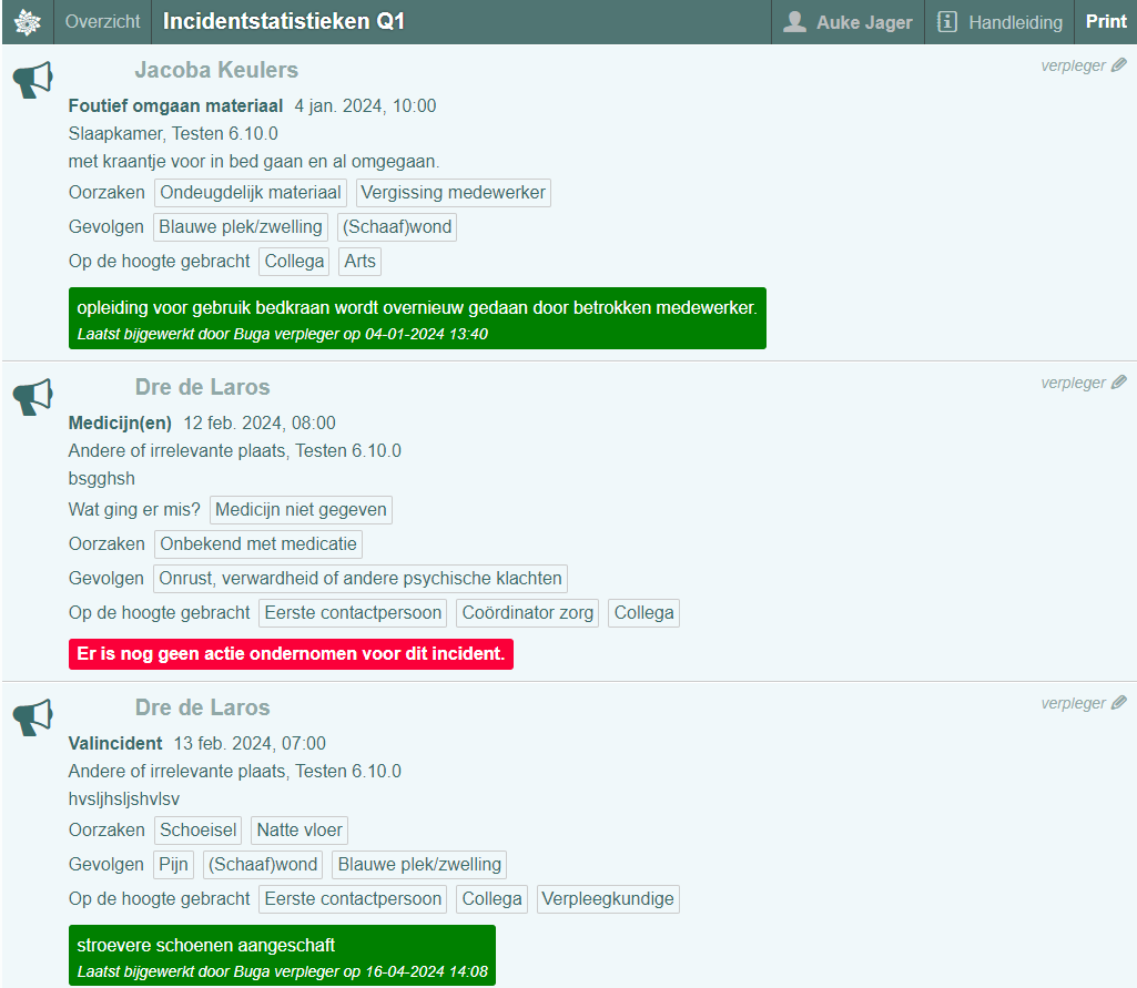 Per locatie wordt het aantal MIC-meldingen per kwartaal en per maand getoond. De balkjes bestaan uit een rood en/of groen gedeelte, waarbij de groene kleur de reeds verwerkte meldingen aangeeft en de rode kleur nog te verwerken incident-meldingen aangeeft.