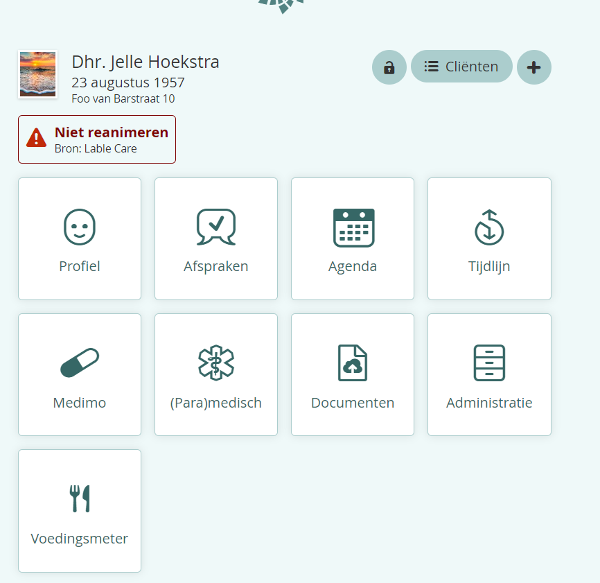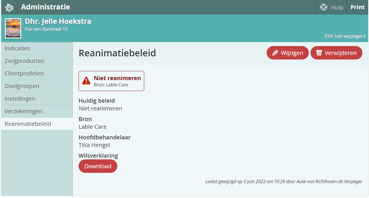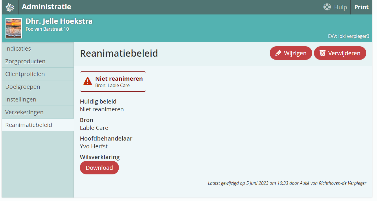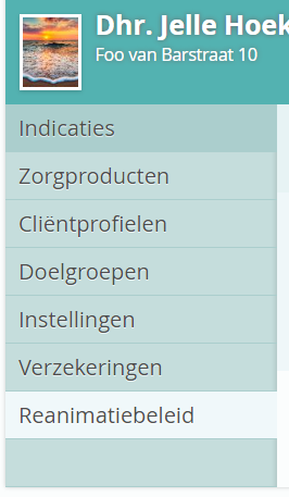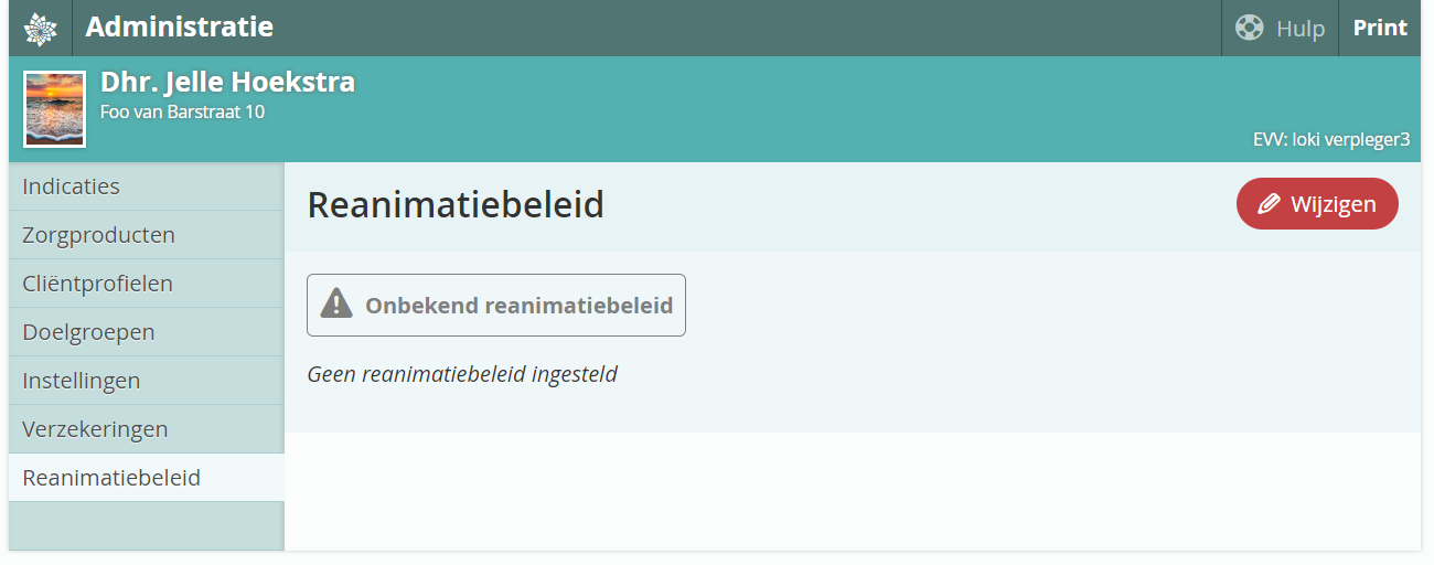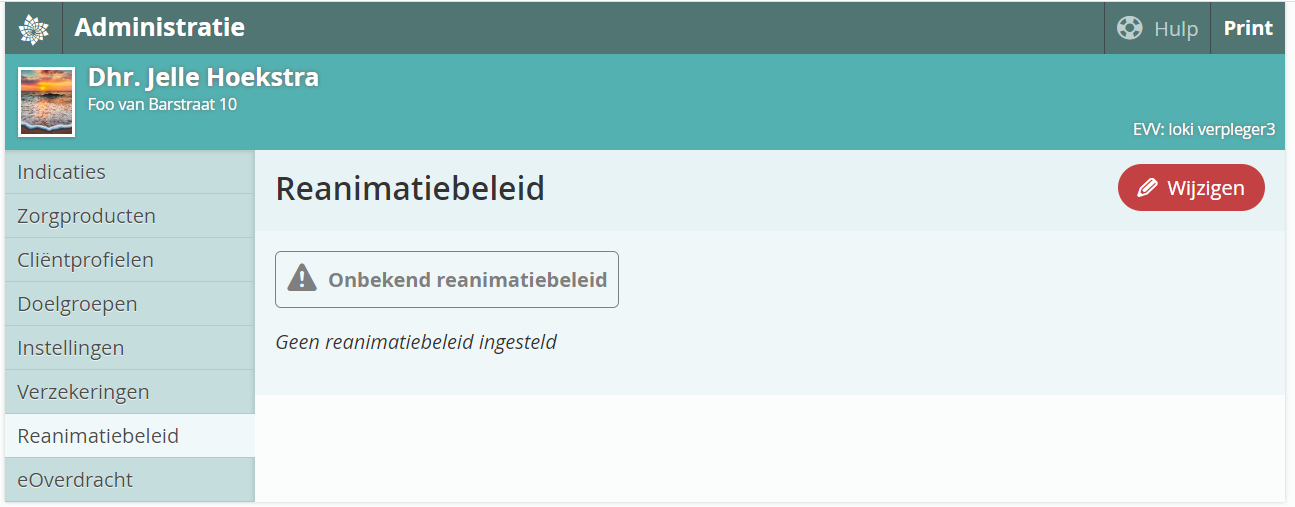 Onder de tegel 'Administratie' kan aangegeven worden welk reanimatiebeleid is afgesproken omtrent de betreffende client. Dit doe je alleen wanneer de client niet opgenomen is in Ysis, maar wel bekend is bij de huisarts.