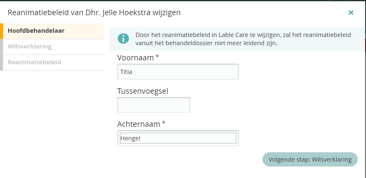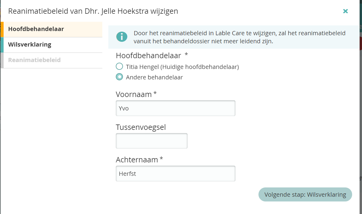 - Geef aan of de huidige hoofdbehandelaar kan blijven staan of vul de gegevens van de nieuwe hoofdbehandelaar in.