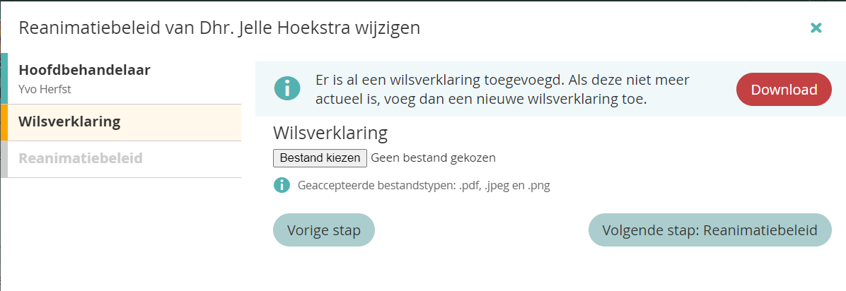 - Er verschijnt een melding dat er al een wilsverklaring is toegevoegd. Indien deze niet meer actueel is, voeg dan een nieuwe wilsverklaring toe.