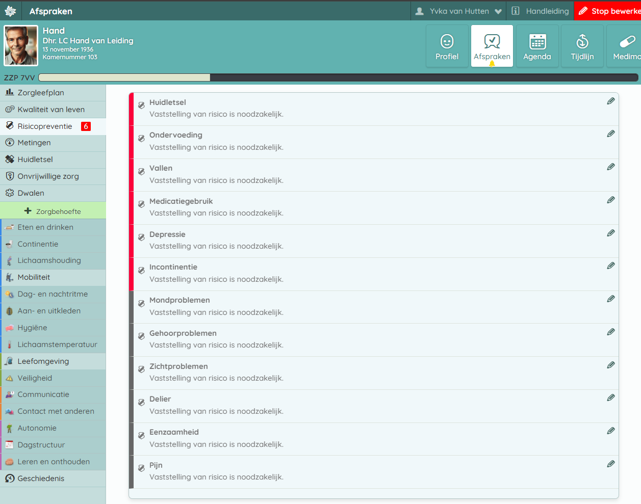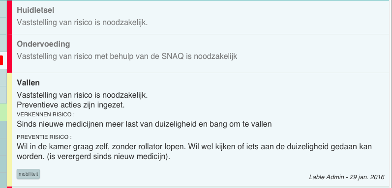 Het signaleren van een risico en het maken van afspraken over opvolging daarvan.Het voorkomen van zorgproblemen is van groot belang, een tijdige signalering van een risico helpt daarbij. Daarnaast vindt er in de zorg een ontwikkeling plaats van 'Altijd veilig' naar in dialoog afspraken maken over de balans 'veilig' versus 'leefplezier'. Daarom ondersteunt Lable Care je met het onderdeel 'Risicopreventie' bij het signaleren van zorgrisico's en het maken van afspraken hierover.