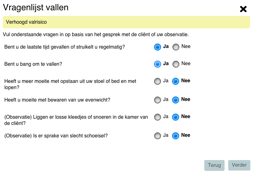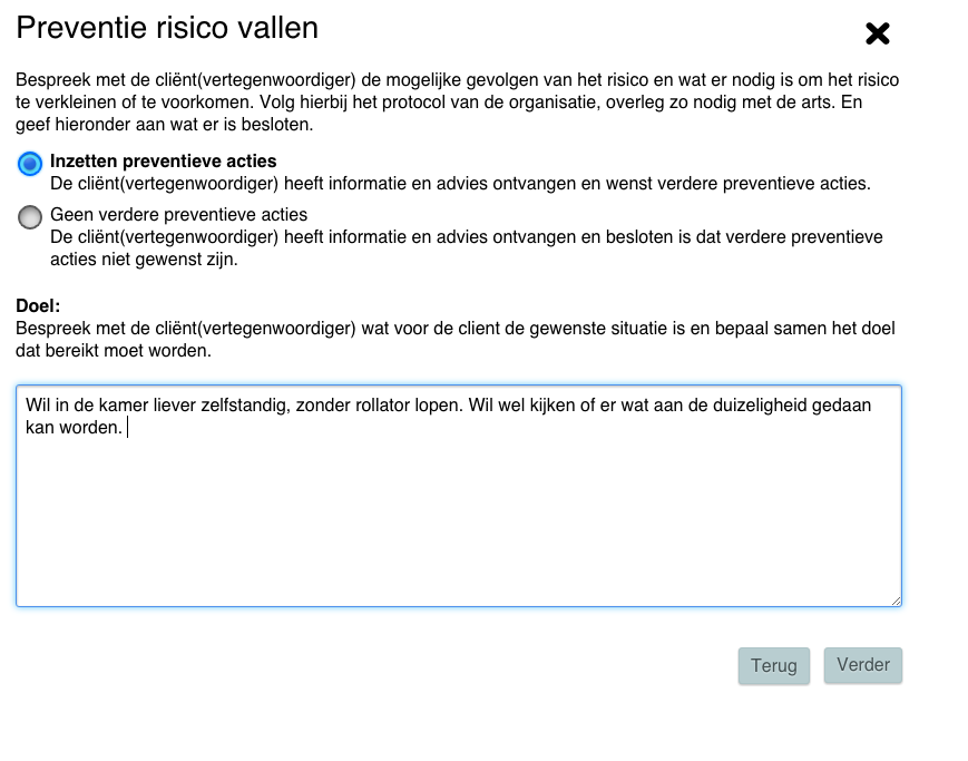 - Selecteer één van de preventie-onderdelen om naar de vragenlijst te gaan, in dit voorbeeld 'Vallen'.