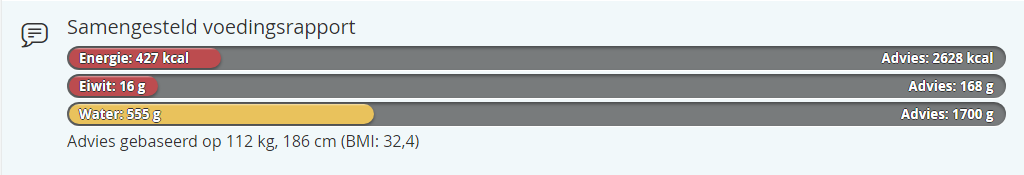 Onder de totalen van 'Energie', 'Eiwit' en 'Water' wordt het gewicht en de lengte getoond en wat de BMI is. Het 'Samengesteld Voedingsrapport' op de 'Tijdlijn' kun je op klikken. Je wordt dan doorgestuurd naar de tegel 'Voedingsmeter'.