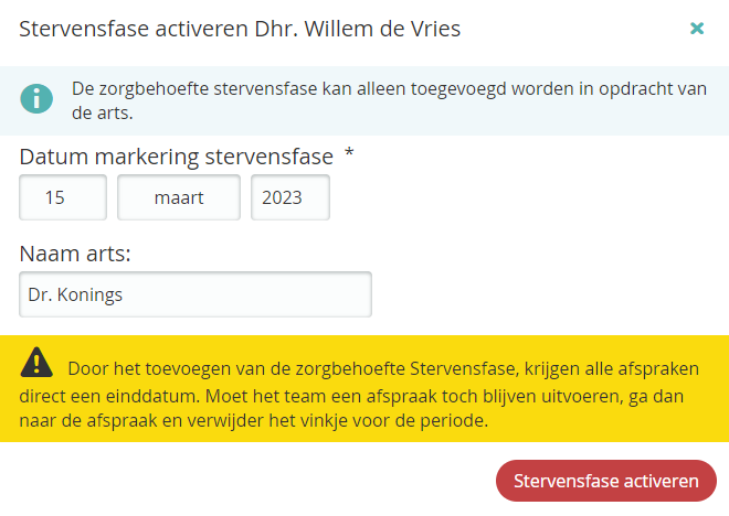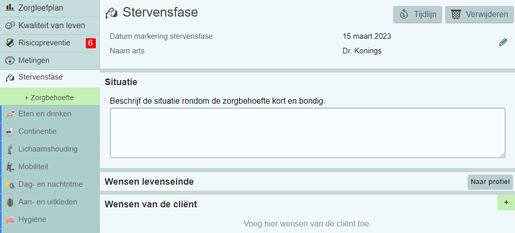 LET OP! De 'Zorgbehoefte Stervensfase' kan alleen worden toegevoegd in opdracht van de arts.Door het toevoegen van de 'Zorgbehoefte Stervensfase', krijgen alle afspraken direct een einddatum. Moet het team een afspraak toch blijven uitvoeren, ga dan naar de afspraak en verwijder het vinkje voor de periode. De 'Wensen over levenseinde' worden ook getoond in het overzicht van de 'Zorgbehoefte Stervensfase'. En er kan een overzicht worden opgevraagd van alle 'Tijdlijn Rapportages' die zijn gekoppeld aan de label 'Stervensfase'.