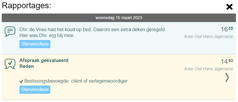 - Er wordt een overzicht getoond van alle 'Rapportages' en 'Zorgveranderingen' met het label 'Stervensfase'.