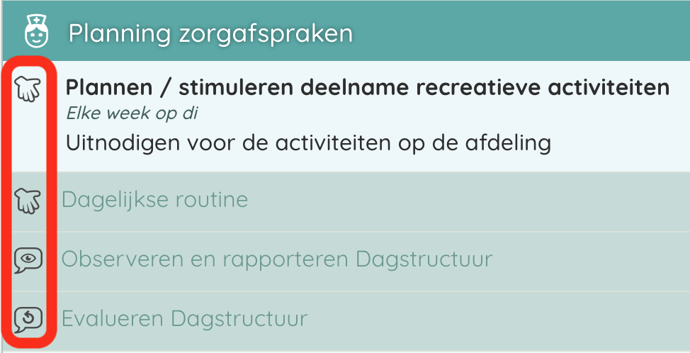 Een 'Handje' wordt weergegeven bij eigen toegevoegde (zorg)activiteiten en activiteiten zonder verder specificatie.