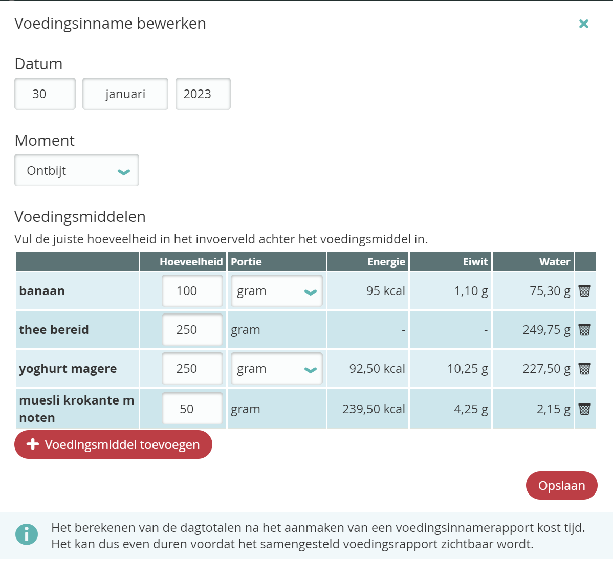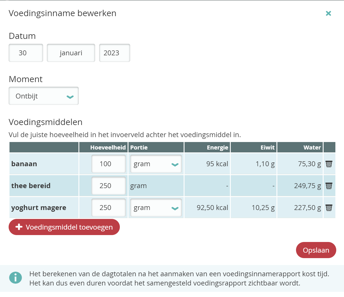 - Klik op 'Opslaan' en de voedingsinname wordt opgeslagen.