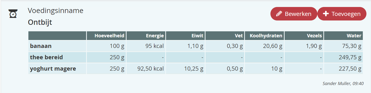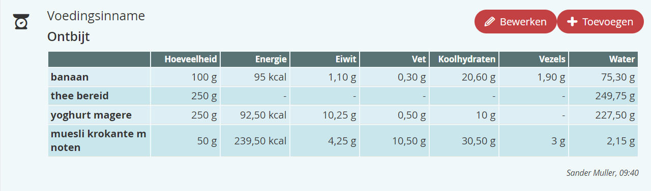 - Klik op 'Opslaan' en de voedingsinname wordt getoond.