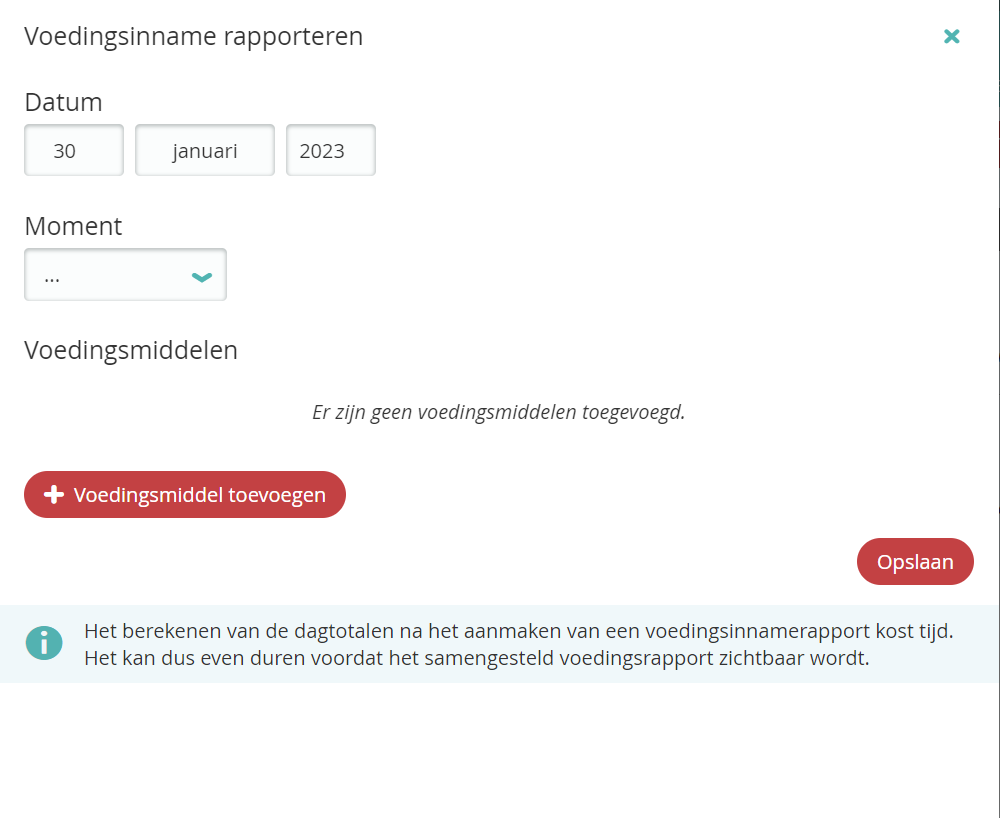 - Klik op de rode '+ Toevoegen' knop om een 'Voedingsinnamerapport' toe te voegen.