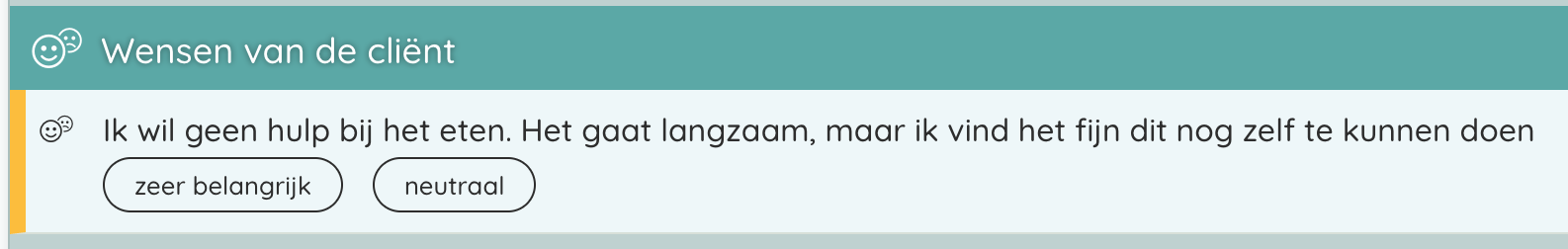 - Het bovenste bolletje geeft aan of deze wens voor de cliënt belangrijk (rechts) of minder belangrijk (links) is.