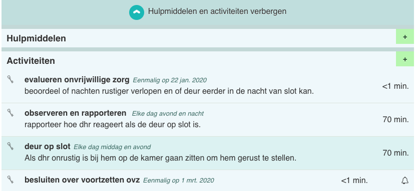 - Het is nu mogelijk om hulpmiddelen of activiteiten toe te voegen door op de '+' te klikken. Denk aan inzet onvrijwillige zorg, observaties, evaluatiemomenten enz.