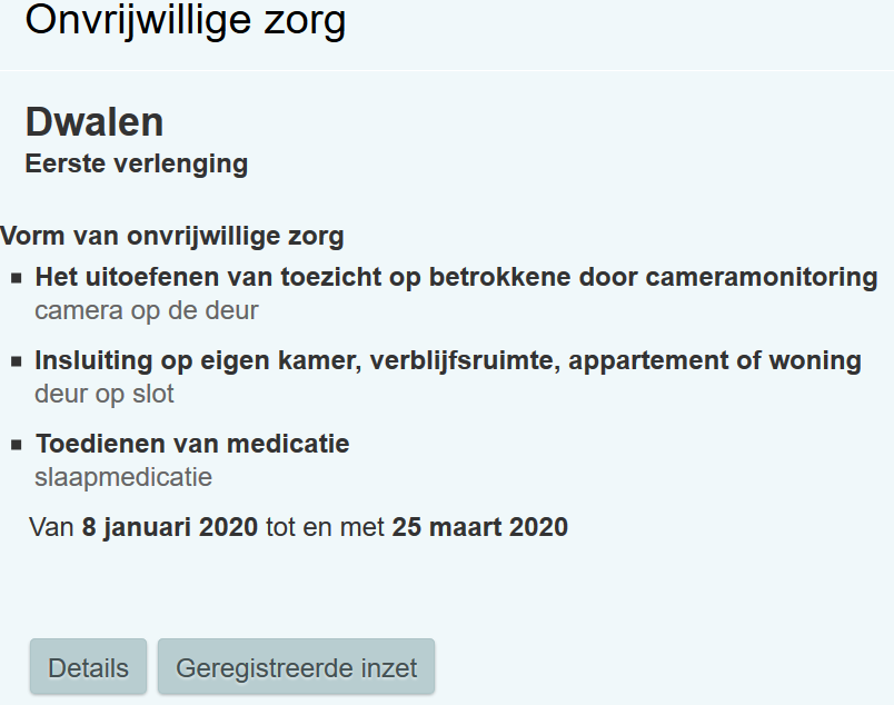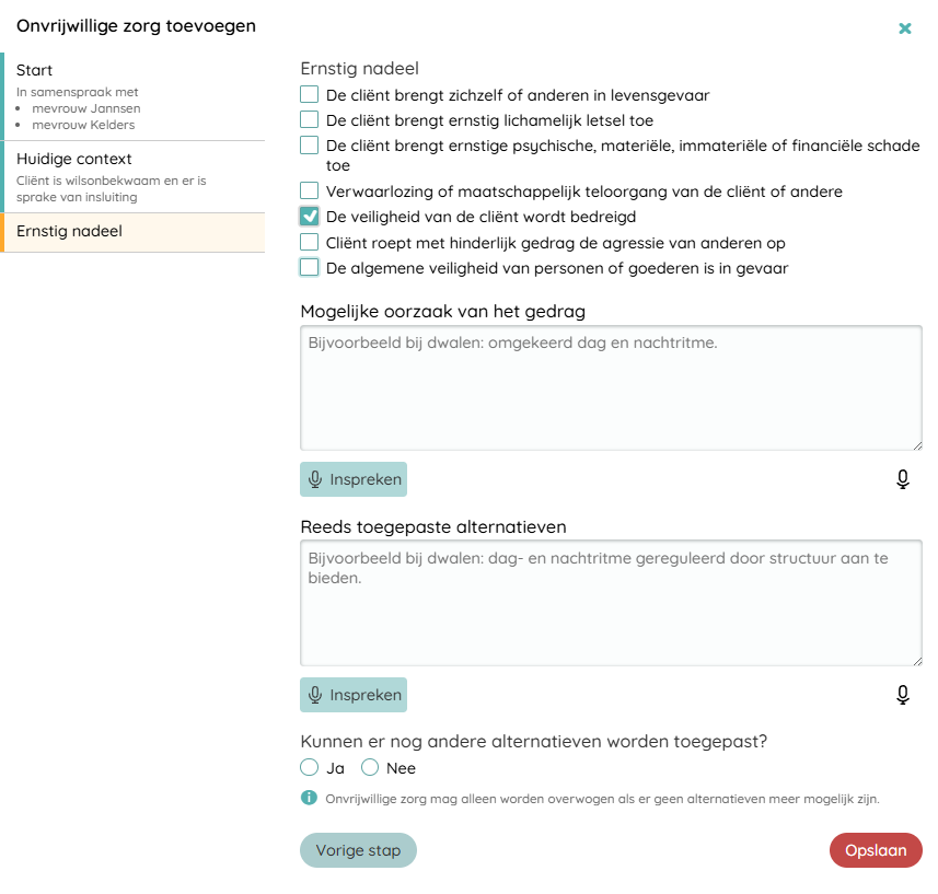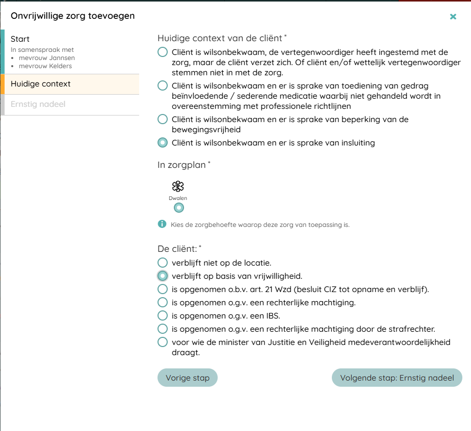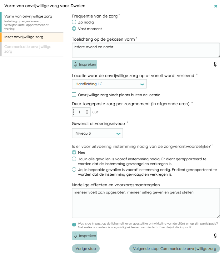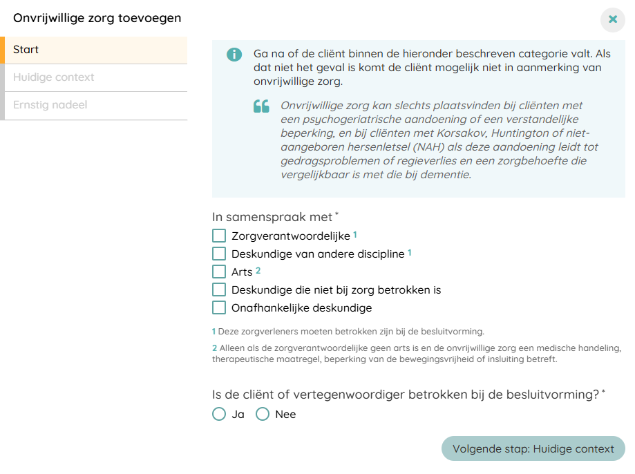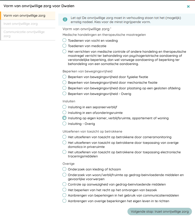 - Klik op 'Volgende stap: Inzet onvrijwillige zorg'