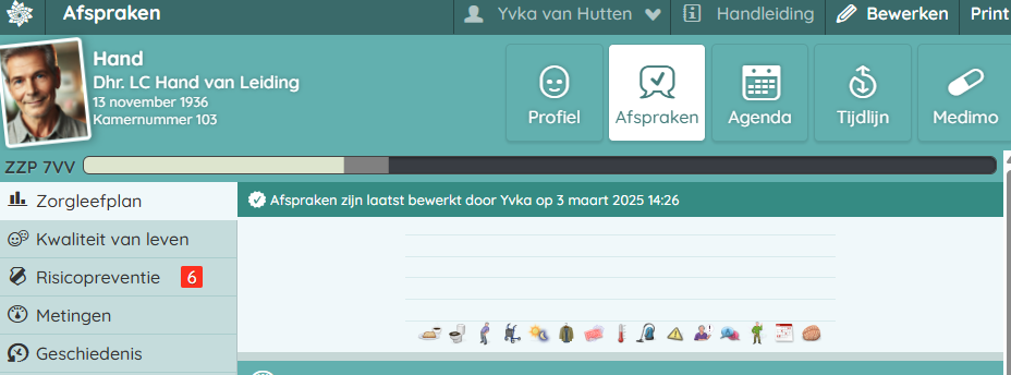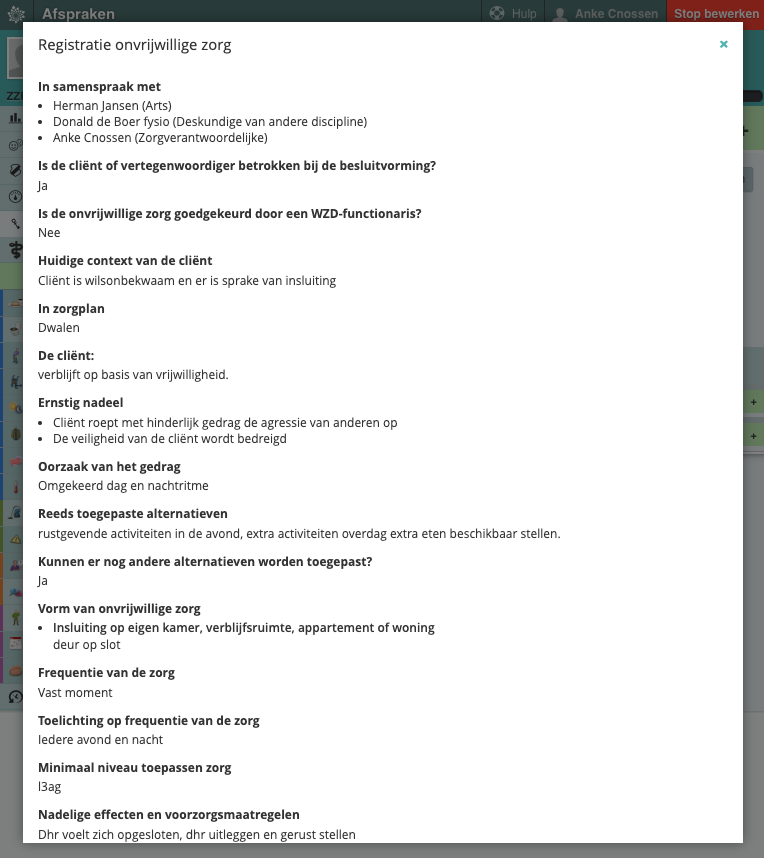 - Je komt nu weer in het Afspraken scherm. Alle informatie mbt de onvrijwillige zorg is nu ingevuld.